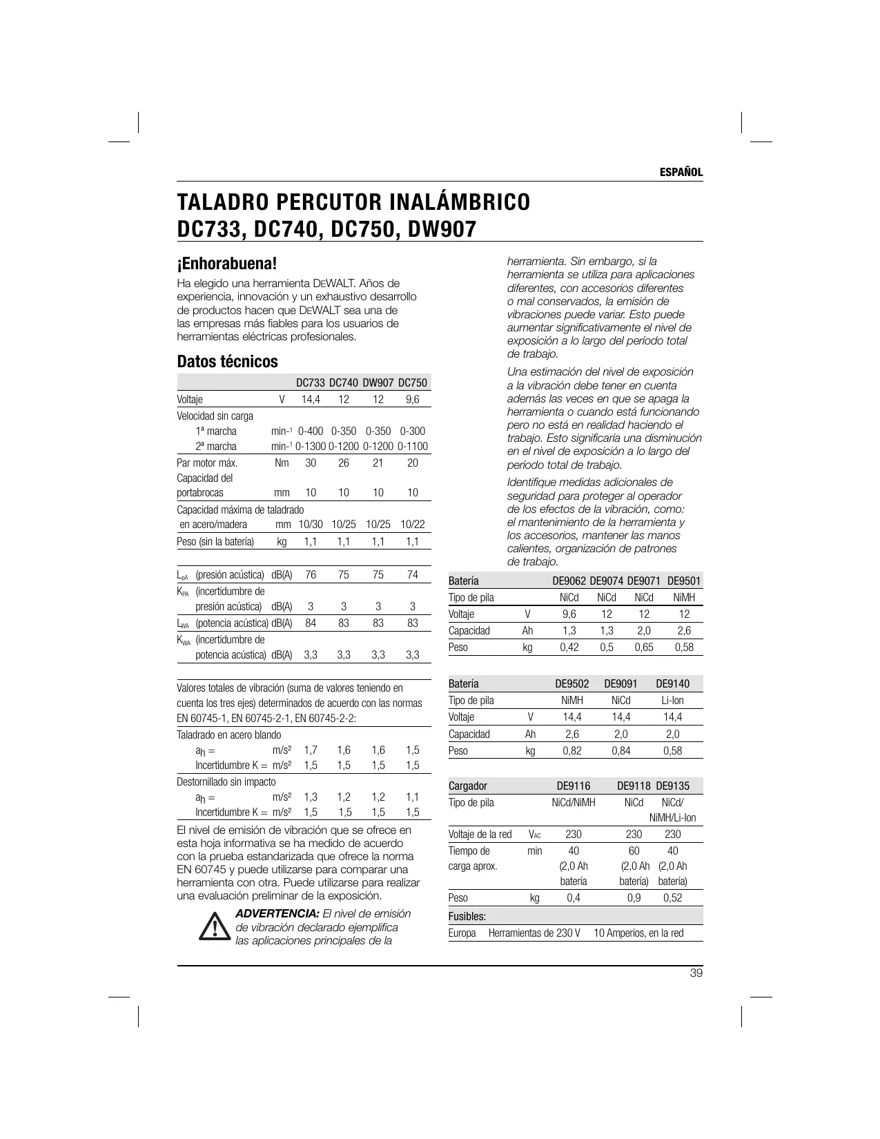 DC733, DC740, DC750, DW907 jEnhorabuena! Ha elegido una herramienta DEWALT. Años de experiencia, innovaciôn y un exhaustivo desarrollo de productos hacen que DEWALT sea una de las empresas més fiables para los usuarios de herramientas eléctricas profesionales. Datos técnicos DC733 DC740 DW907 DC750 Voltaje V__144 12 12 9,6 Velocidad sin carga 1% marcha min-: 0-400 0-350 0-350 0-300 2 marcha min-' 0-1300 0-1200 0-1200 0-1100 Par motor mäx. Nm 30 26 21 20 Capacidad del portabrocas mm 10 10 10 10 Capacidad mâxima de taladrado en acero/madera mm _10/30 10/25 10/25 10/22 Peso (sin la bateria) kg 11 11 LA ti herramienta. Sin embargo, si la herramienta se utliza para aplicaciones diferentes, con accesorios diferentes o mal conservados, la emisiôn de vibraciones puede variar. Esto puede aumentar significativamente el nivel de exposiciôn à lo largo del periodo total de trabajo. Una estimaciôn del nivel de exposiciôn & la vibraciôn debe tener en cuenta ademés las veces en que se apaga la herramienta o cuando esté funcionando pero no est en realidad haciendo el trabajo. Esto signifcaria una disminuciôn en el nivel de exposiciôn à lo largo del periodo total de trabajo. Identifique medidas adicionales de seguridad para proteger al operador de los efectos de la vibraciôn, como: el mantenimiento de la herramienta y los accesorios, mantener las manos calentes, organizaciôn de patrones de trabajo. La_(resiôn avis) GBA) 76 75 75 74 Bateria DE9062 DE9074 DE9071 DE9501 Ka man de EN 3 8 8 Tipo de pla Nicd Nid NCd NiMH ms Ve a e En CEE — V0 nr 7 7 a Fe mn ae _ A) Capacidad Ah 13 13 20 26 a (nceridumbre de potencia acüstic) dB 33 33 33 33 Pe50 kg 042 05 065 058 Valores totales de vibraciôn (suma de valores teniendo en Baterla DE9502 DE9091 DE9140 cuenta los tres ejes) determinados de acuerdo con las normas Tipo de pila NiMH NiCd Lion EN 60745-1, EN 60745-2-1, EN 60745-2-2 Votaje V_ 144 144 14 Faladrado en acero blando Capacidad An 26 20 20 = me 17 16 16 15 Peso ÿ 08 08 05 Incertidumbre K= ms? 15 15 15 15 Destomillado sin impacto Cargador DE9116 DE9118 DE9135