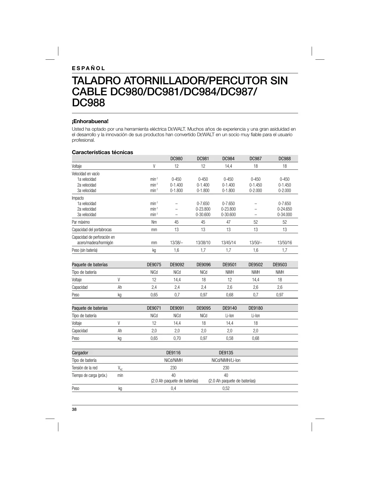 DC988 iEnhorabuena! Usted ha optado por una herramienta eléctrica DEWALT. Muchos años de experiencia y una gran asiduidad en el desarroll y la innovaciôn de sus productos han convertido DEWALT en un socio muy fiable para el usuario profesional. Caracteristicas técnicas DC980 DC981 DC984 DC987 DC988 Vote v 12 12 144 18 18 Velocidad en vacio taweocidad min 0450 0-450 0-450 0450 0-450 2a velcidad min* 0-1.400 01400 0-1400 0-1.450 0-1.450 Sa velcidad min*_0-1.800 01800 0-1.800 0-2.000 0-2000 Impacto ta weocidad min - 07650 0-7.650 - 0-7.650 2a velcidad min - 023800 0-23.800 - 0-24,650 Sa velcidad min - 030.600 0-30.600 - 0-34.000 Par méximo Nm 45 45 47 52 52 Capacidad del porabrocas mm 13 13 13 13 13 Capacidad de peroraciôn en acero/madera/hornigén mm 1988 193810 1945/14 13/50 13/5016 Peso (in bater) kg 16 17 a 16 17 Paquete de baterias DE9075 DE9O92 DE9096 DE9501 DE9502 DE9503 Tipo de bateria NiCd NCd NiCd NiMH NiMH NiMH Vote v 12 144 18 12 144 18 Capacidad an 24 24 24 26 26 26 Peso kg 065 07 097 0.68 07 0.97 Paquete de baterias DE9071 DEVO9 © DE9095 DEI40 DE9180 Tipo de bateria NiCd NCd NiCd Lion Lion Vote v 12 144 18 144 18 Capacidad an 20 20 20 20 20 Peso kg 065 0,70 097 058 068 Cargador DE9H16 DE9135 Tipo de bateria NiCd/NiMH NiCd/MMH/L-lon Tensiôn dela red Ve 230 230 Tiempo de carga frôx) min 40 40 (2.0 Ah paquete de baterias) (2.0 Ah paquete de baterias) Peso kg 04 052
