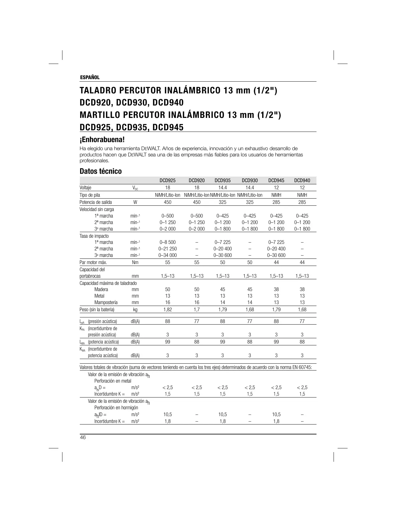 jEnhorabuena! Ha elegido una herramienta DEWALT. Años de experiencia, innovaciôn y un exhaustivo desarrollo de productos hacen que DEWALT sea una de las empresas més fiables para los usuarios de herramientas profesionales. Datos técnico