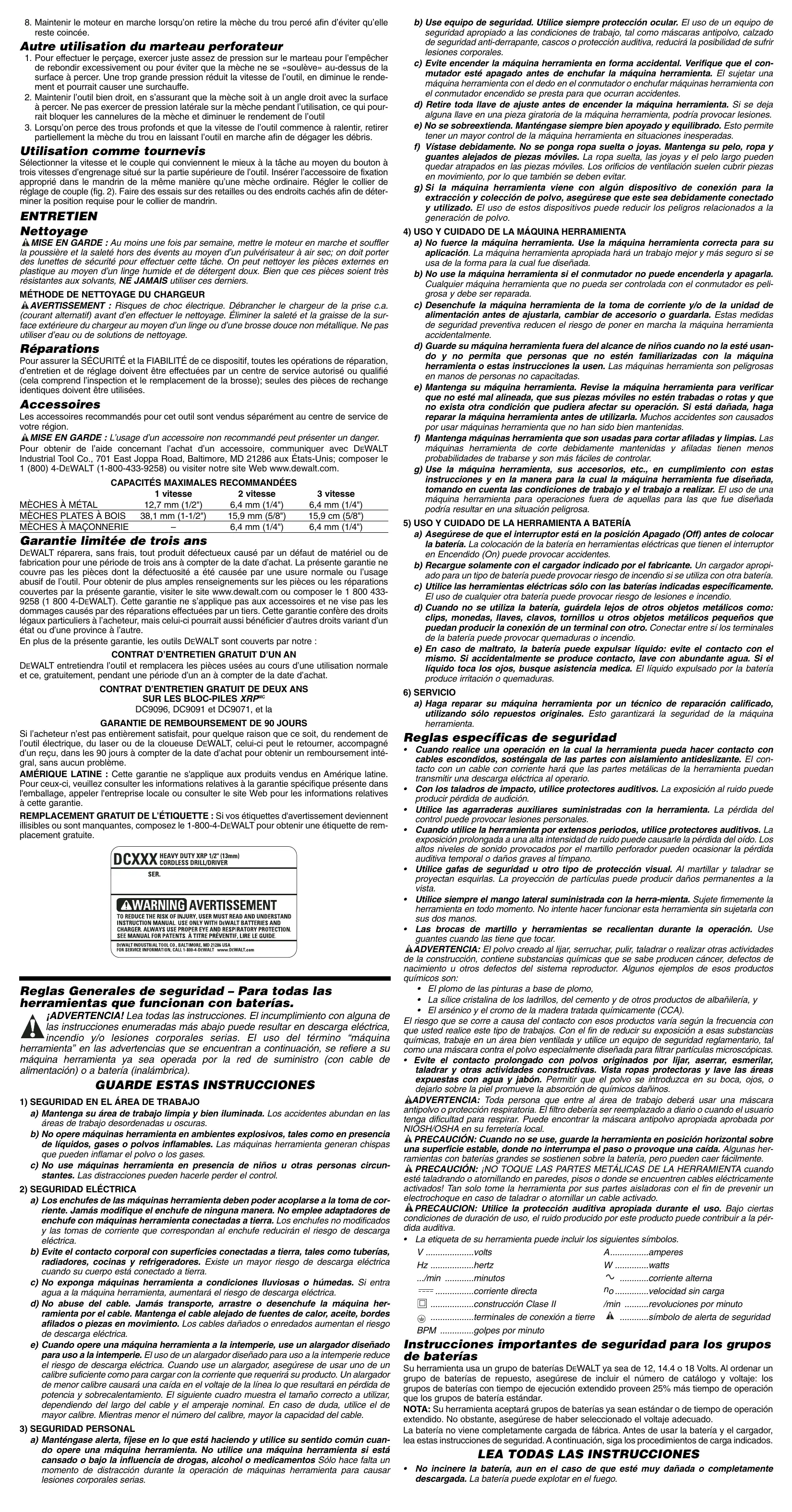 DeWALT reparar, sin cargo,rialquier falla que surja de defectos en el material o la fabricacion del producto, por hasta tres años a contear de la Fecha de compra.Esta garantia no cubre fallas de las piezas causadas por su desgaste normal o abuso a la herramenta. Para mayores detalles sobre la cobertura de la garantia e informacion acerca de reparaciones realizadas bajo garantia, visitenos en www.dewalt.com o dirigase al centro de service más cercano.Esta garantia no aplica a accesos o a daños causados por reparaciones realizadas o intentadas por terceros.Esta garantía le otorga direchos legales espécicos, además de los cuales pueda tenerthers dependiendo del estado o la province en que se enquiryr.