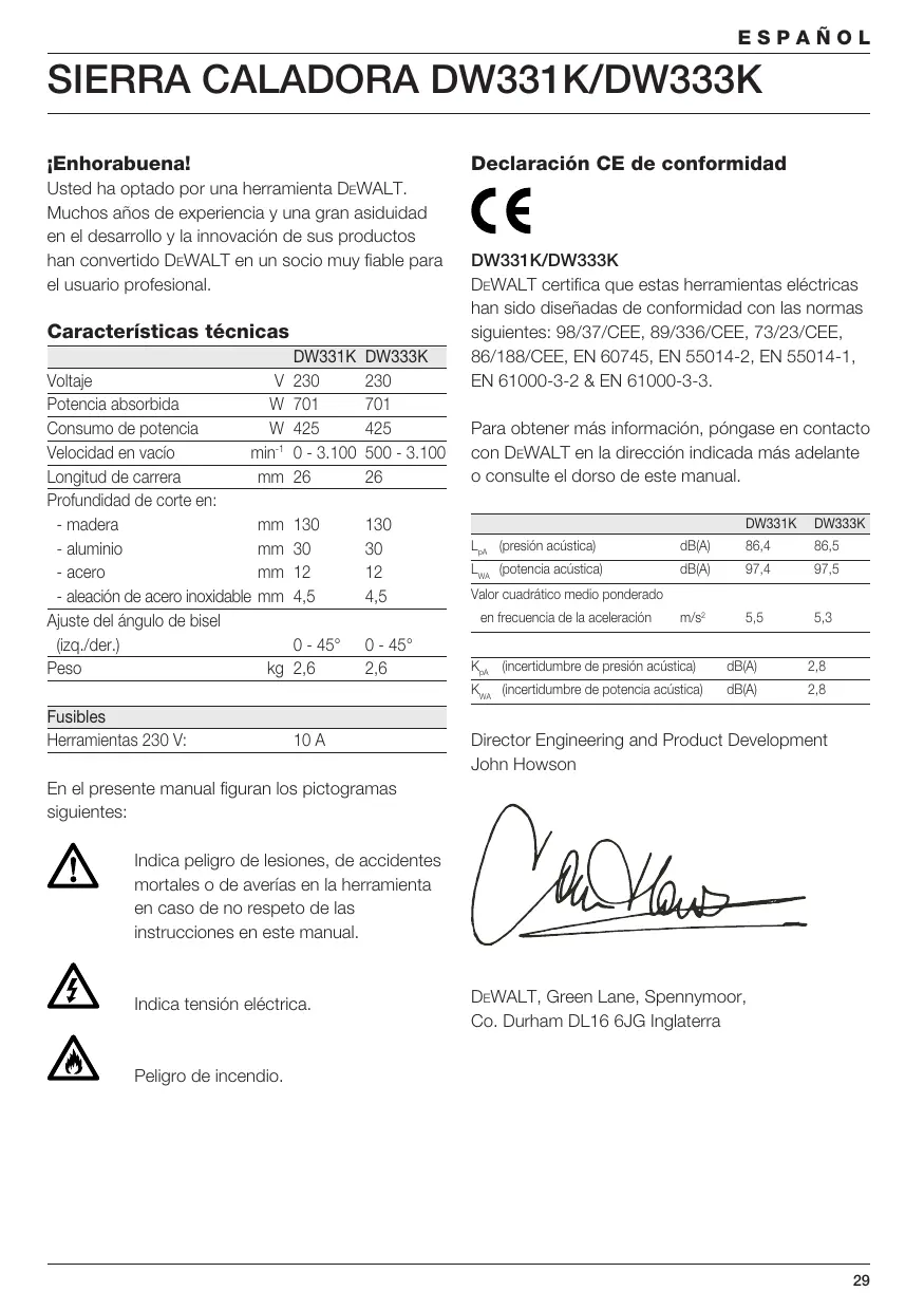 2,6 DW331K/DW333K DEWALT certifica que estas herramientas eléctricas han sido diseñadas de conformidad con las normas siguientes: 98/37/CEE, 89/336/CEE, 73/23/CEE, 86/188/CEE, EN 60745, EN 55014-2, EN 55014-1, EN 61000-3-2 & EN 61000-3-3. Para obtener más información, póngase en contacto con DEWALT en la dirección indicada más adelante o consulte el dorso de este manual. DW331K DW333K LpA (presión acústica) dB(A) 86,4 86,5 LWA (potencia acústica) dB(A) 97,4 97,5 m/s2 5,5 5,3 Valor cuadrático medio ponderado en frecuencia de la aceleración 10 A KpA (incertidumbre de presión acústica) dB(A) 2,8 KWA (incertidumbre de potencia acústica) dB(A) 2,8 En el presente manual figuran los pictogramas siguientes: Indica peligro de lesiones, de accidentes mortales o de averías en la herramienta en caso de no respeto de las instrucciones en este manual. Indica tensión eléctrica. Peligro de incendio.
