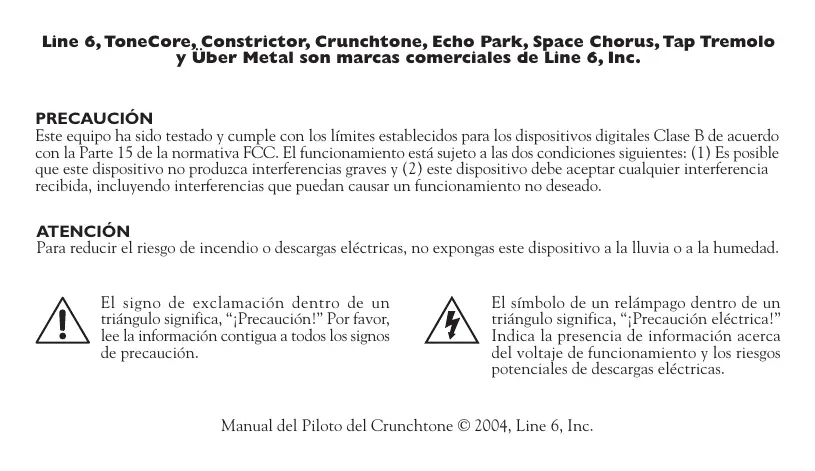 Line 6, ToneCore, Constrictor, Crunchtone, Echo Park, Space Chorus, Tap Tremolo y Über Metal son marcas comerciales de Line 6, Inc. PRECAUCIÔN Este equipo ha sido restado y cumple con los limites establecidos para los dispositivos digitales Clase B de acuerdo con la Parte 15 de la normativa FCC. El funcionamiento estä sujeto a las dos condiciones siguientes: (1) Es posible que este dispositivo no produzca interferencias graves ÿ (2) este dispositivo debe aceptar cualquier interferencia recibida, incluyendo interferencias que puedan causar un funcionamiento no deseado. ATENCIÔN Para reducir el riesgo de incendio o descargas eléctricas, no expongas este dispositivo a la Iluvia o a la humedad. El signo de exclamacién dentro de un El sfmbolo de un relmpago dentro de un triängulo significa, “;Precauciôn!” Por favor, triängulo significa, “;Precauciôn eléctrica!” lee la informacién contigua a todos los signos Indica la presencia de informaciôn acerca de precauciôn. del voltaje de funcionamiento ÿ los riesgos potenciales de descargas eléctricas. Manual del Piloto del Crunchtone © 2004, Line 6, Inc.