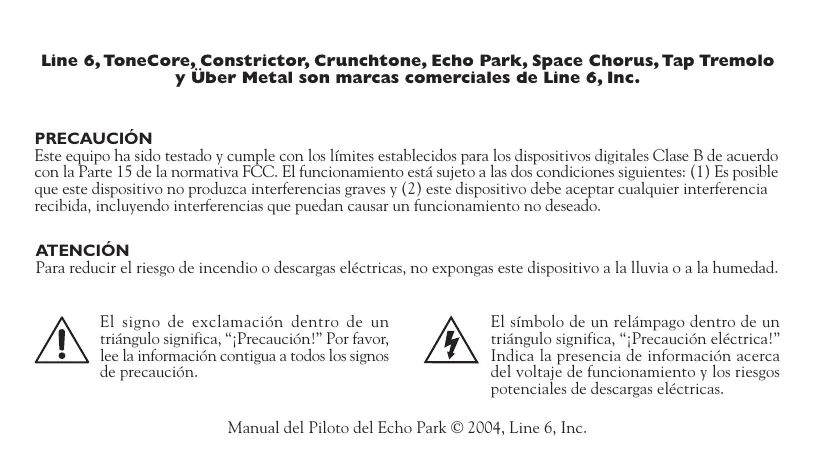 16 VDC Tonos de ejemplo MIX MOD REPEAT TIME Slappy-Verb Recógete el pelo, súbete los pantalones, fúmate un cigarrillo y utiliza este ajuste cuando quieras ecos “slapback” de rock fantásticos. MIX MOD REPEAT TIME D y n a m i c D e l ay ( d u c k i n g ) Aquí tienes la fijación mágica para evitar que el sonido quede abrumado con tus ecos. Deja caer el volumen de los ecos cuando interpretas, y los recupera cuando paras. MIX MOD REPEAT TIME 60’s Reverse Este ajuste graba la interpretación en una máquina del tiempo de hidrógeno, la transmite a un estupendo estudio del 1966, la graba en una cinta, rebobina la cinta, vuelve a transportarla hasta el futuro y la devuelve al Echo Park. Relájate y déjate llevar por la corriente… Manual del Piloto del Echo Park MIX MOD REPEAT TIME Marca los ajustes referentes al mando y a los conmutadores para fijar tus tonos preferidos. TRAILS OFF • ON Tus ajustes de tono MIX MOD REPEAT TIME Marca los ajustes referentes al mando y a los conmutadores para fijar tus tonos preferidos. TRAILS OFF • ON Manual del Piloto del Echo Park Registra tu compra en www.line6.com/register. O completa y envía la tarjeta de registro incluida. Cuando te hayas registrado, podremos gestionar los problemas de forma más rápida y te pondremos al corriente acerca de la información, actualizaciones y otras noticias de forma anticipada. Gracias por adelantado por registrarte. ¡Que tengas mucha suerte con tu música! Line 6, Inc. (a partir de ahora “Line 6”) te garantiza que el producto de Line 6 que acabas de adquirir, siempre que lo hayas hecho en un distribuidor autorizado de Line 6 de Estados Unidos (“EE.UU.”) o Canadá, no tendrá defectos en los materiales ni en la fabricación durante un periodo de un (1) año a partir de la fecha de adquisición original. Ponte en contacto con tu distribuidor para obtener información acerca de la garantía y otros servicios fuera de los EE.UU. y Canadá. Durante el periodo de garantía, Line 6 reparará o sustituirá, según considere oportuno, cualquier producto que sea defectuoso después de ser inspeccionado por Line 6. Line 6 se reserva el derecho de actualizar cualquier dispositivo que repare y de cambiar o mejorar el diseño del producto en cualquier momento sin previo aviso. En las reparaciones autorizadas, Line 6 se reserva el derecho de utilizar partes y montajes reacondicionados como sustitutos de garantía. Esta garantía comprende el comprador original. Esta garantía puede transferirse a cualquier persona que posteriormente pueda comprar el producto, siempre que la transferencia se realice dentro del periodo de garantía pertinente y siempre que Line 6 disponga de los siguientes documentos: (i) toda la información referente al registro de la garantía (como se indica en la tarjeta de registro) para el propietario, (ii) la prueba de la transferencia dentro de treinta (30) días de la adquisición de la transferencia y (iii) una fotocopia del recibo de compra original. Line 6 determinará la cobertura de la garantía a su discreción. Esta garantía es individual. Line 6 no autoriza que ningún tercero, incluyendo distribuidores o representantes de ventas, asuma ninguna responsabilidad en nombre de Line 6 ni que realice ninguna garantía en nombre de Line 6. Información acerca de la garantía Line 6 puede pedir, si lo considera necesario, una prueba de la fecha de adquisición original en forma de copia con fecha de la factura o del recibo de compra del distribuidor autorizado. La asistencia y la reparación de los productos de Line 6 sólo se realizará en las fábricas de Line 6 o en un centro autorizado de Line 6. Line 6 puede pedir una autorización por avanzado de las reparaciones a los centros autorizados. Una asistencia, reparación o modificación no autorizadas invalidarán la garantía. RENUNCIA Y LIMITACIÓN DE LA GARANTÍA LA GARANTÍA ANTERIOR ES LA ÚNICA GARANTÍA QUE OFRECE LINE 6 Y SE OFRECE EN LUGAR DE TODAS LAS DEMÁS GARANTÍAS. TODAS LAS GARANTÍAS IMPLÍCITAS, INCLUYENDO LAS GARANTÍAS DE COMERCIALIZACIÓN O DE ADECUACIÓN PARA CUALQUIER PROPÓSITO EN PARTICULAR, QUE NO SE INCLUYAN EN LAS DISPOSICIONES ESPECÍFICAS DE ESTA GARANTÍA, SE DESCARTARÁN Y EXCLUIRÁN DE ESTA GARANTÍA. CUANDO FINALICE EL PERIODO DE GARANTÍA EXPRESO APLICABLE (1 AÑO), LINE 6 NO TENDRÁ NINGÚN TIPO DE OBLIGACIÓN CON LA GARANTÍA, YA SEA DE FORMA EXPRESA O IMPLÍCITA. EN NINGÚN CASO, LINE 6 SERÁ RESPONSABLE DE NINGÚN DAÑO ESPECIAL, SECUNDARIO NI CONSECUENCIAL QUE HAYA EXPERIMENTADO EL COMPRADOR O CUALQUIER OTRA PERSONA, INCLUYENDO SIN RESTRICCIONES, CUALQUIER DAÑO O PÉRDIDA DE BENEFICIOS O NEGOCIOS, NI CUALQUIER DAÑO QUE DERIVE DE UN USO O FUNCIONAMIENTO DEL PRODUCTO,YA SEA DE ORIGEN CONTRACTUAL O NO. LINE 6 NO SERÁ RESPONSABLE DE NINGÚN GASTO, RECLAMACIÓN NI PLEITO QUE SURJA DE LO QUE ESTÉ RELACIONADO CON LO ANTERIOR. Algunos estados no permiten la exclusión o limitación de garantías implícitas. Por esta razón, es posible que estés exento de algunas de las limitaciones y exclusiones anteriores. Esta garantía te otorga derechos legales específicos y también puedes tener otros derechos, que pueden variar de un estado a otro. Esta garantía sólo se aplica a los productos que se venden y se utilizan en EE.UU. y Canadá. Line 6 no será responsable de los daños ni pérdidas que se deriven de actos negligentes o intencionales del transporte. Ponte en contacto con el transportista para iniciar los procedimientos oportunos en el caso de que se produjeran daños o pérdidas durante el transporte. Servicio de atención al cliente Antes de ponerte en contacto con el equipo del Servicio de atención al cliente de Line 6, lee esta documentación con atención para ver si encuentras la respuesta a tus preguntas. Encontrarás más información de ayuda en la página de soporte del sitio web de Line 6 en www.line6.com/support, que incluye el sistema de búsqueda en la base de conocimientos/FAQ