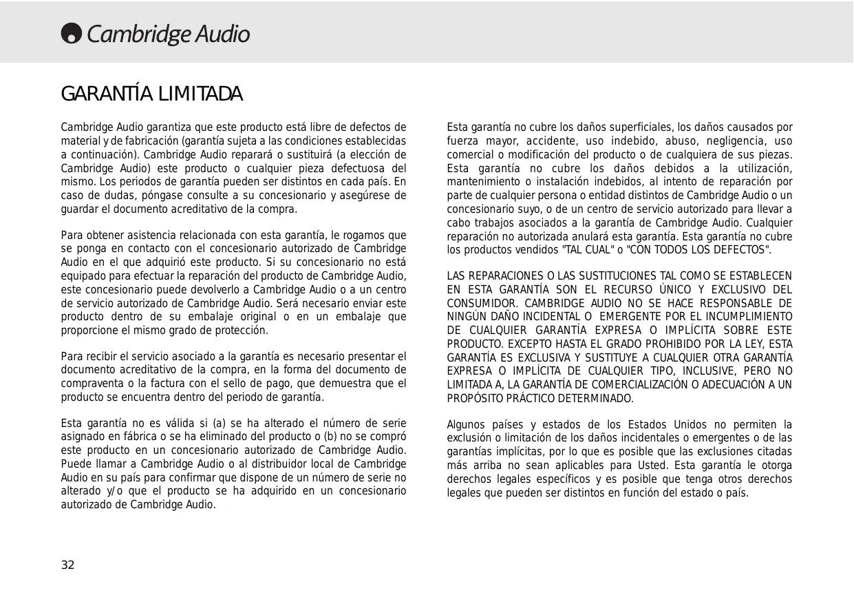Esta garantía no cubre los daños debidos a la utilización, mantenimiento o instalación indebidos, al intento de reparación por parte de cualquier persona o entidad distintos de Cambridge Audio o un concesionario suyo, o de un centro de servicio autorizado para llevar a cabo trabajos asociados a la garantía de Cambridge Audio. Cualquier reparación no autorizada anulará esta garantía. Esta garantía no cubre los productos vendidos "TAL CUAL" o "CON TODOS LOS DEFECTOS". LAS REPARACIONES O LAS SUSTITUCIONES TAL COMO SE ESTABLECEN EN ESTA GARANTÍA SON EL RECURSO ÚNICO Y EXCLUSIVO DEL CONSUMIDOR. CAMBRIDGE AUDIO NO SE HACE RESPONSABLE DE NINGÚN DAÑO INCIDENTAL O EMERGENTE POR EL INCUMPLIMIENTO DE CUALQUIER GARANTÍA EXPRESA O IMPLÍCITA SOBRE ESTE PRODUCTO. EXCEPTO HASTA EL GRADO PROHIBIDO POR LA LEY, ESTA GARANTÍA ES EXCLUSIVA Y SUSTITUYE A CUALQUIER OTRA GARANTÍA EXPRESA O IMPLÍCITA DE CUALQUIER TIPO, INCLUSIVE, PERO NO LIMITADA A, LA GARANTÍA DE COMERCIALIZACIÓN O ADECUACIÓN A UN PROPÓSITO PRÁCTICO DETERMINADO. Algunos países y estados de los Estados Unidos no permiten la exclusión o limitación de los daños incidentales o emergentes o de las garantías implícitas, por lo que es posible que las exclusiones citadas más arriba no sean aplicables para Usted. Esta garantía le otorga derechos legales específicos y es posible que tenga otros derechos legales que pueden ser distintos en función del estado o país.