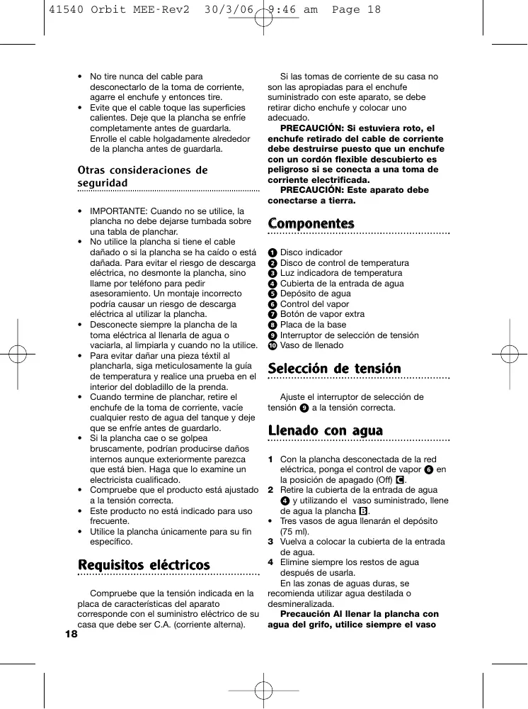 • IMPORTANTE: Cuando no se utilice, la plancha no debe dejarse tumbada sobre una tabla de planchar. • No utilice la plancha si tiene el cable dañado o si la plancha se ha caído o está dañada. Para evitar el riesgo de descarga eléctrica, no desmonte la plancha, sino llame por teléfono para pedir asesoramiento. Un montaje incorrecto podría causar un riesgo de descarga eléctrica al utilizar la plancha. • Desconecte siempre la plancha de la toma eléctrica al llenarla de agua o vaciarla, al limpiarla y cuando no la utilice. • Para evitar dañar una pieza téxtil al plancharla, siga meticulosamente la guía de temperatura y realice una prueba en el interior del dobladillo de la prenda. • Cuando termine de planchar, retire el enchufe de la toma de corriente, vacíe cualquier resto de agua del tanque y deje que se enfríe antes de guardarlo. • Si la plancha cae o se golpea bruscamente, podrían producirse daños internos aunque exteriormente parezca que está bien. Haga que lo examine un electricista cualificado. • Compruebe que el producto está ajustado a la tensión correcta. • Este producto no está indicado para uso frecuente. • Utilice la plancha únicamente para su fin específico.