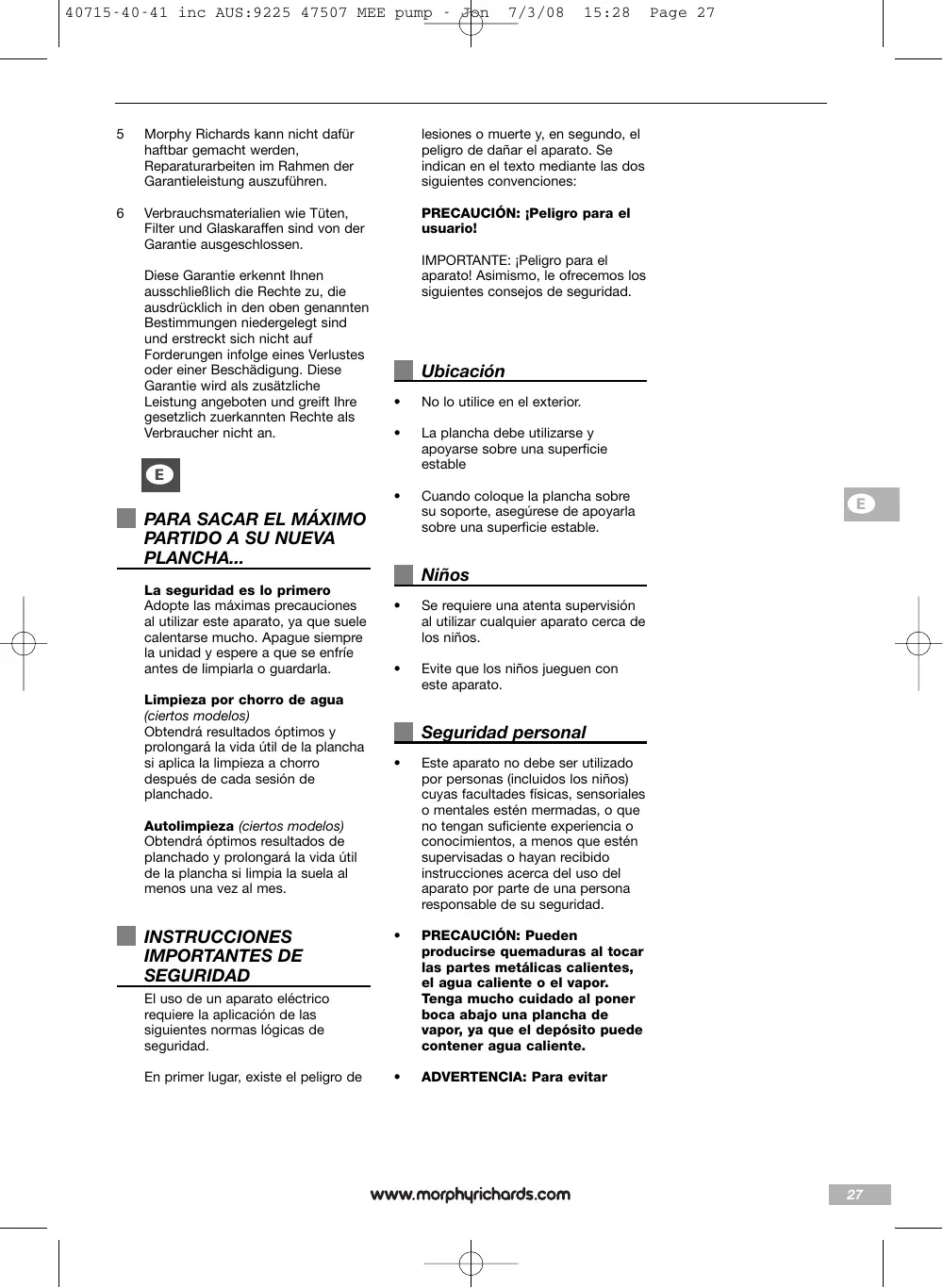 e Los productos Morphy Richards están concebidos solamente para usodoméstico. Morphy Richards tiene una política de mejora en la calidad ydiseño de sus artículos. La compañía, por lo tanto, se reserva el derecho decambiar en cualquier momento las especificaciones de sus modelos.