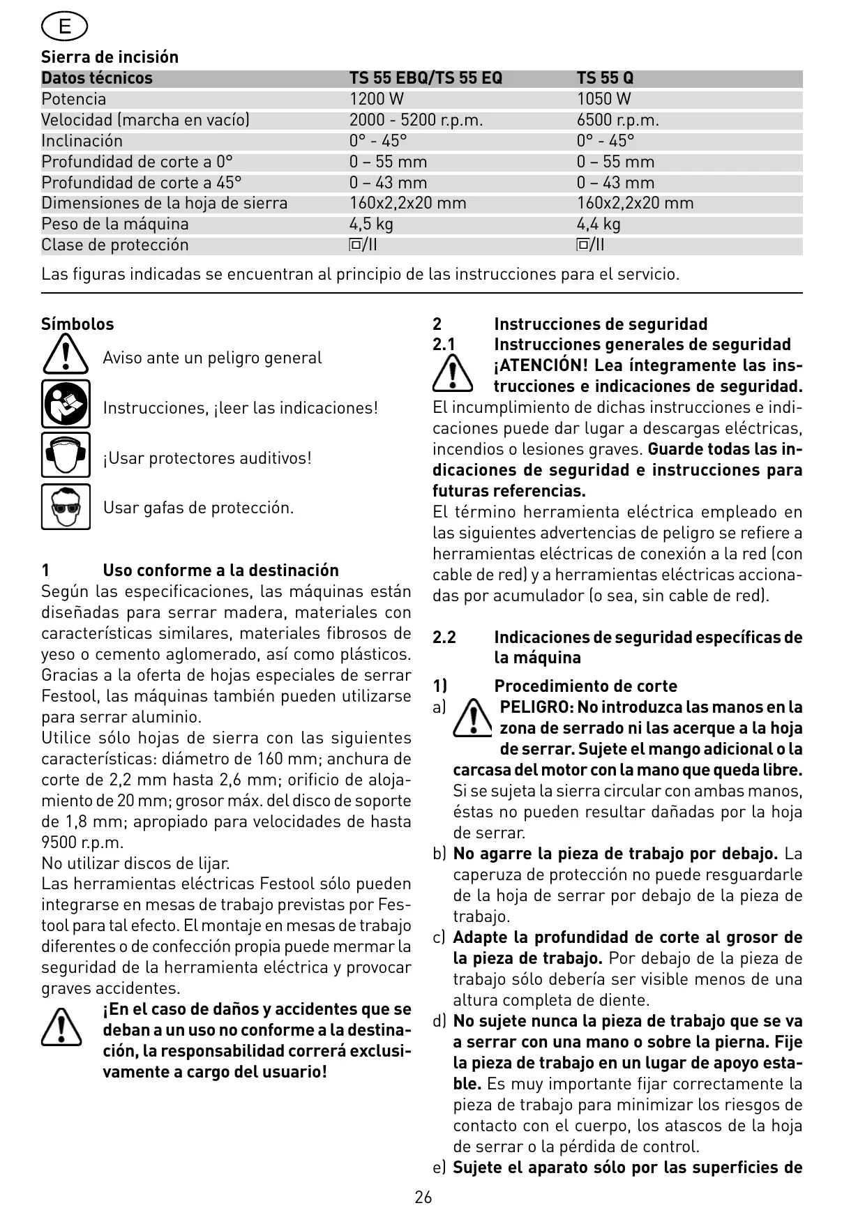 Uso conforme a la destinación Según las especificaciones, las máquinas están diseñadas para serrar madera, materiales con características similares, materiales fibrosos de yeso o cemento aglomerado, así como plásticos. Gracias a la oferta de hojas especiales de serrar Festool, las máquinas también pueden utilizarse para serrar aluminio. Utilice sólo hojas de sierra con las siguientes características: diámetro de 160 mm; anchura de corte de 2,2 mm hasta 2,6 mm; orificio de alojamiento de 20 mm; grosor máx. del disco de soporte de 1,8 mm; apropiado para velocidades de hasta 9500 r.p.m. No utilizar discos de lijar. Las herramientas eléctricas Festool sólo pueden integrarse en mesas de trabajo previstas por Festool para tal efecto. El montaje en mesas de trabajo diferentes o de confección propia puede mermar la seguridad de la herramienta eléctrica y provocar graves accidentes. ¡En el caso de daños y accidentes que se deban a un uso no conforme a la destinación, la responsabilidad correrá exclusivamente a cargo del usuario!