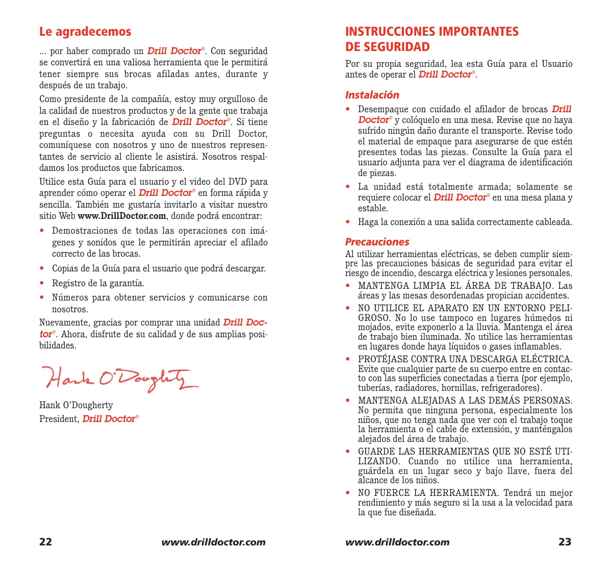 - Mantenimiento del Drill Doctor® Le agradecemos por haber comprado un Drill Doctor . Con seguridad se convertirá en una valiosa herramienta que le permitirá tener siempre sus brocas afiladas antes, durante y después de un trabajo. Como presidente de la compañía, estoy muy orgulloso de la calidad de nuestros productos y de la gente que trabaja en el diseño y la fabricación de Drill Doctor®. Si tiene preguntas o necesita ayuda con su Drill Doctor, comuníquese con nosotros y uno de nuestros representantes de servicio al cliente le asistirá. Nosotros respaldamos los productos que fabricamos. Utilice esta Guía para el usuario y el video del DVD para aprender cómo operar el Drill Doctor® en forma rápida y sencilla. También me gustaría invitarlo a visitar nuestro sitio Web www.DrillDoctor.com, donde podrá encontrar: p. 38