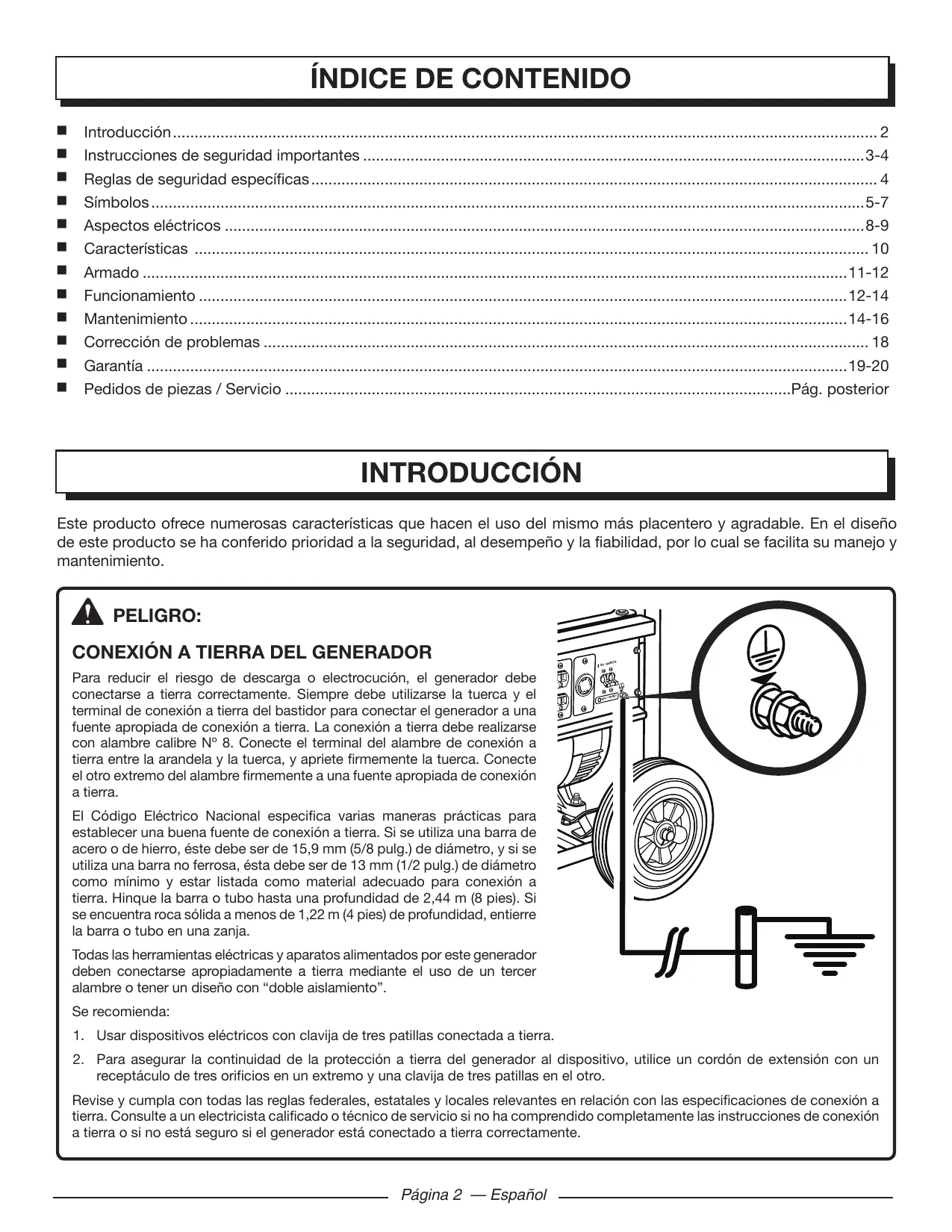 Su generador ha sido diseñado y fabricado de conformidad con estrictas normas para brindar fiabilidad, facilidad de uso y seguridad para el operador. Con el debido cuidado, le brindará muchos años de sólido y eficiente funcionamiento. PELIGRO: El incumplimiento de las instrucciones en este manual del operador puede CAUSARLE LA MUERTE O LESIONARLE GRAVEMENTE.