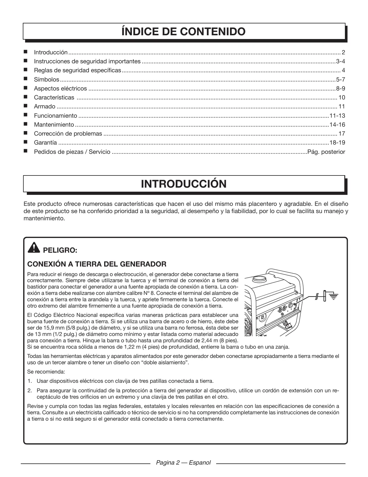 Para reducir el riesgo de descarga o electrocución, el generator debe conectarse a tierra correctamente. Siempre debe utilizes la tuerca y el terminal de connexion a tierra del bastidor para conectar el generator a una fuente apropiada de connexion a tierra. La connexion a tierra debe realizarse con alambre calibre N^ 8. Conecte el terminal del alambre de connexion a tierra entre la arandela y la tuerca, y apriete firmamente la tuerca. Conecte el除外 del alambre firmamente a una fuente apropiada de connexion a tierra.