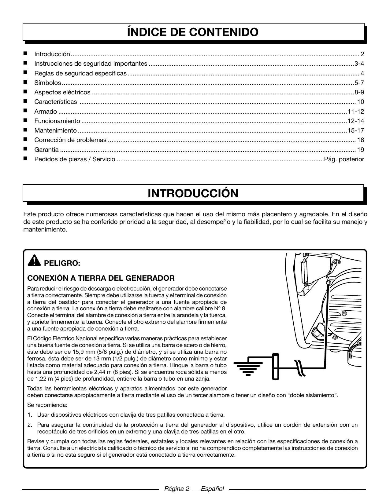 INTRODUCCIÓN Este producto ofrece numerosas características que hacen el uso del mismo más placentero y agradable. En el diseño de este producto se ha conferido prioridad a la seguridad, al desempeño y la fiabilidad, por lo cual se facilita su manejo y mantenimiento. peligro: Conexión a tierra del generador Para reducir el riesgo de descarga o electrocución, el generador debe conectarse a tierra correctamente. Siempre debe utilizarse la tuerca y el terminal de conexión a tierra del bastidor para conectar el generador a una fuente apropiada de conexión a tierra. La conexión a tierra debe realizarse con alambre calibre Nº 8. Conecte el terminal del alambre de conexión a tierra entre la arandela y la tuerca, y apriete firmemente la tuerca. Conecte el otro extremo del alambre firmemente a una fuente apropiada de conexión a tierra. El Código Eléctrico Nacional especifica varias maneras prácticas para establecer una buena fuente de conexión a tierra. Si se utiliza una barra de acero o de hierro, éste debe ser de 15,9 mm (5/8 pulg.) de diámetro, y si se utiliza una barra no ferrosa, ésta debe ser de 13 mm (1/2 pulg.) de diámetro como mínimo y estar listada como material adecuado para conexión a tierra. Hinque la barra o tubo hasta una profundidad de 2,44 m (8 pies). Si se encuentra roca sólida a menos de 1,22 m (4 pies) de profundidad, entierre la barra o tubo en una zanja. Todas las herramientas eléctricas y aparatos alimentados por este generador deben conectarse apropiadamente a tierra mediante el uso de un tercer alambre o tener un diseño con “doble aislamiento”. Se recomienda: