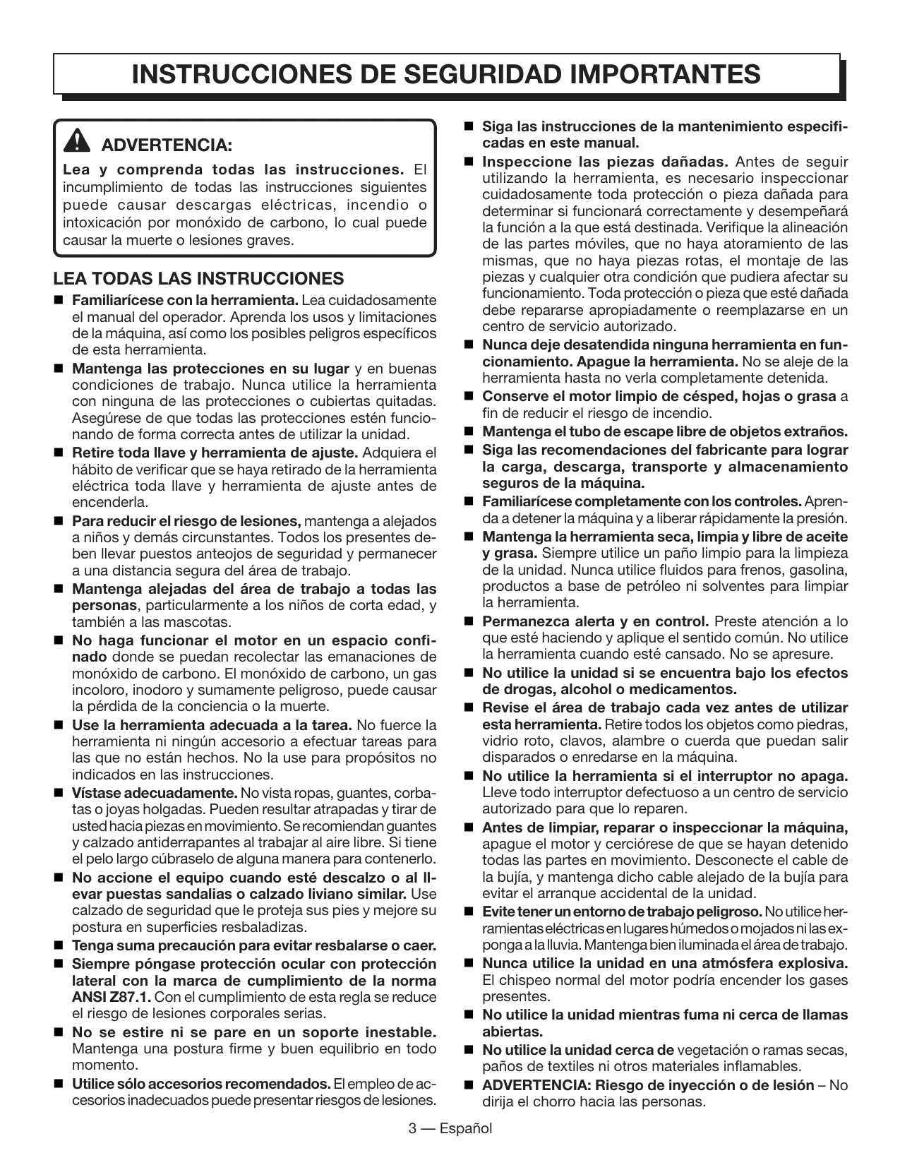 Familiarícese con la herramienta. Lea cuidadosamente el manual del operador. Aprenda los usos y limitaciones de la máquina, así como los posibles peligros específicos de esta herramienta. Mantenga las protecciones en su lugar y en buenas condiciones de trabajo. Nunca utilice la herramienta con ninguna de las protecciones o cubiertas quitadas. Asegúrese de que todas las protecciones estén funcionando de forma correcta antes de utilizar la unidad. Retire toda llave y herramienta de ajuste. Adquiera el hábito de verificar que se haya retirado de la herramienta eléctrica toda llave y herramienta de ajuste antes de encenderla. Para reducir el riesgo de lesiones, mantenga a alejados a niños y demás circunstantes. Todos los presentes deben llevar puestos anteojos de seguridad y permanecer a una distancia segura del área de trabajo. Mantenga alejadas del área de trabajo a todas las personas, particularmente a los niños de corta edad, y también a las mascotas. No haga funcionar el motor en un espacio confinado donde se puedan recolectar las emanaciones de monóxido de carbono. El monóxido de carbono, un gas incoloro, inodoro y sumamente peligroso, puede causar la pérdida de la conciencia o la muerte. Use la herramienta adecuada a la tarea. No fuerce la herramienta ni ningún accesorio a efectuar tareas para las que no están hechos. No la use para propósitos no indicados en las instrucciones. Vístase adecuadamente. No vista ropas, guantes, corbatas o joyas holgadas. Pueden resultar atrapadas y tirar de usted hacia piezas en movimiento. Se recomiendan guantes y calzado antiderrapantes al trabajar al aire libre. Si tiene el pelo largo cúbraselo de alguna manera para contenerlo. No accione el equipo cuando esté descalzo o al llevar puestas sandalias o calzado liviano similar. Use calzado de seguridad que le proteja sus pies y mejore su postura en superficies resbaladizas. Tenga suma precaución para evitar resbalarse o caer. Siempre póngase protección ocular con protección lateral con la marca de cumplimiento de la norma ANSI Z87.1. Con el cumplimiento de esta regla se reduce el riesgo de lesiones corporales serias. No se estire ni se pare en un soporte inestable. Mantenga una postura firme y buen equilibrio en todo momento. Utilice sólo accesorios recomendados. El empleo de accesorios inadecuados puede presentar riesgos de lesiones. Siga las instrucciones de la mantenimiento especificadas en este manual. Inspeccione las piezas dañadas. Antes de seguir utilizando la herramienta, es necesario inspeccionar cuidadosamente toda protección o pieza dañada para determinar si funcionará correctamente y desempeñará la función a la que está destinada. Verifique la alineación de las partes móviles, que no haya atoramiento de las mismas, que no haya piezas rotas, el montaje de las piezas y cualquier otra condición que pudiera afectar su funcionamiento. Toda protección o pieza que esté dañada debe repararse apropiadamente o reemplazarse en un centro de servicio autorizado. Nunca deje desatendida ninguna herramienta en funcionamiento. Apague la herramienta. No se aleje de la herramienta hasta no verla completamente detenida. Conserve el motor limpio de césped, hojas o grasa a fin de reducir el riesgo de incendio. Mantenga el tubo de escape libre de objetos extraños. Siga las recomendaciones del fabricante para lograr la carga, descarga, transporte y almacenamiento seguros de la máquina. Familiarícese completamente con los controles. Aprenda a detener la máquina y a liberar rápidamente la presión. Mantenga la herramienta seca, limpia y libre de aceite y grasa. Siempre utilice un paño limpio para la limpieza de la unidad. Nunca utilice fluidos para frenos, gasolina, productos a base de petróleo ni solventes para limpiar la herramienta. Permanezca alerta y en control. Preste atención a lo que esté haciendo y aplique el sentido común. No utilice la herramienta cuando esté cansado. No se apresure. No utilice la unidad si se encuentra bajo los efectos de drogas, alcohol o medicamentos. Revise el área de trabajo cada vez antes de utilizar esta herramienta. Retire todos los objetos como piedras, vidrio roto, clavos, alambre o cuerda que puedan salir disparados o enredarse en la máquina. No utilice la herramienta si el interruptor no apaga. Lleve todo interruptor defectuoso a un centro de servicio autorizado para que lo reparen. Antes de limpiar, reparar o inspeccionar la máquina, apague el motor y cerciórese de que se hayan detenido todas las partes en movimiento. Desconecte el cable de la bujía, y mantenga dicho cable alejado de la bujía para evitar el arranque accidental de la unidad. Evite tener un entorno de trabajo peligroso. No utilice herramientas eléctricas en lugares húmedos o mojados ni las exponga a la lluvia. Mantenga bien iluminada el área de trabajo. Nunca utilice la unidad en una atmósfera explosiva. El chispeo normal del motor podría encender los gases presentes. No utilice la unidad mientras fuma ni cerca de llamas abiertas. No utilice la unidad cerca de vegetación o ramas secas, paños de textiles ni otros materiales inflamables. ADVERTENCIA: Riesgo de inyección o de lesión – No dirija el chorro hacia las personas. 3 — Español