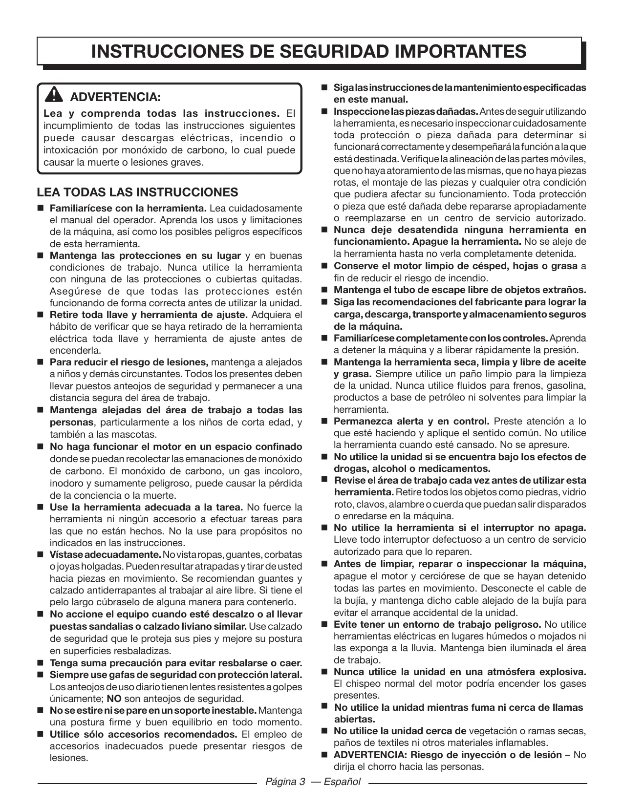 Familiarícese con la herramienta. Lea cuidadosamente el manual del operador. Aprenda los usos y limitaciones de la máquina, así como los posibles peligros específicos de esta herramienta. Mantenga las protecciones en su lugar y en buenas condiciones de trabajo. Nunca utilice la herramienta con ninguna de las protecciones o cubiertas quitadas. Asegúrese de que todas las protecciones estén funcionando de forma correcta antes de utilizar la unidad. Retire toda llave y herramienta de ajuste. Adquiera el hábito de verificar que se haya retirado de la herramienta eléctrica toda llave y herramienta de ajuste antes de encenderla. Para reducir el riesgo de lesiones, mantenga a alejados a niños y demás circunstantes. Todos los presentes deben llevar puestos anteojos de seguridad y permanecer a una distancia segura del área de trabajo. Mantenga alejadas del área de trabajo a todas las personas, particularmente a los niños de corta edad, y también a las mascotas. No haga funcionar el motor en un espacio confinado donde se puedan recolectar las emanaciones de monóxido de carbono. El monóxido de carbono, un gas incoloro, inodoro y sumamente peligroso, puede causar la pérdida de la conciencia o la muerte. Use la herramienta adecuada a la tarea. No fuerce la herramienta ni ningún accesorio a efectuar tareas para las que no están hechos. No la use para propósitos no indicados en las instrucciones. Vístase adecuadamente. No vista ropas, guantes, corbatas o joyas holgadas. Pueden resultar atrapadas y tirar de usted hacia piezas en movimiento. Se recomiendan guantes y calzado antiderrapantes al trabajar al aire libre. Si tiene el pelo largo cúbraselo de alguna manera para contenerlo. No accione el equipo cuando esté descalzo o al llevar puestas sandalias o calzado liviano similar. Use calzado de seguridad que le proteja sus pies y mejore su postura en superficies resbaladizas. Tenga suma precaución para evitar resbalarse o caer. Siempre use gafas de seguridad con protección lateral. Los anteojos de uso diario tienen lentes resistentes a golpes únicamente; no son anteojos de seguridad. No se estire ni se pare en un soporte inestable. Mantenga una postura firme y buen equilibrio en todo momento. Utilice sólo accesorios recomendados. El empleo de accesorios inadecuados puede presentar riesgos de lesiones. Siga las instrucciones de la mantenimiento especificadas en este manual. Inspeccione las piezas dañadas. Antes de seguir utilizando la herramienta, es necesario inspeccionar cuidadosamente toda protección o pieza dañada para determinar si funcionará correctamente y desempeñará la función a la que está destinada. Verifique la alineación de las partes móviles, que no haya atoramiento de las mismas, que no haya piezas rotas, el montaje de las piezas y cualquier otra condición que pudiera afectar su funcionamiento. Toda protección o pieza que esté dañada debe repararse apropiadamente o reemplazarse en un centro de servicio autorizado. Nunca deje desatendida ninguna herramienta en funcionamiento. Apague la herramienta. No se aleje de la herramienta hasta no verla completamente detenida. Conserve el motor limpio de césped, hojas o grasa a fin de reducir el riesgo de incendio. Mantenga el tubo de escape libre de objetos extraños. Siga las recomendaciones del fabricante para lograr la carga, descarga, transporte y almacenamiento seguros de la máquina. Familiarícese completamente con los controles. Aprenda a detener la máquina y a liberar rápidamente la presión. Mantenga la herramienta seca, limpia y libre de aceite y grasa. Siempre utilice un paño limpio para la limpieza de la unidad. Nunca utilice fluidos para frenos, gasolina, productos a base de petróleo ni solventes para limpiar la herramienta. Permanezca alerta y en control. Preste atención a lo que esté haciendo y aplique el sentido común. No utilice la herramienta cuando esté cansado. No se apresure. No utilice la unidad si se encuentra bajo los efectos de drogas, alcohol o medicamentos. Revise el área de trabajo cada vez antes de utilizar esta herramienta. Retire todos los objetos como piedras, vidrio roto, clavos, alambre o cuerda que puedan salir disparados o enredarse en la máquina. No utilice la herramienta si el interruptor no apaga. Lleve todo interruptor defectuoso a un centro de servicio autorizado para que lo reparen. Antes de limpiar, reparar o inspeccionar la máquina, apague el motor y cerciórese de que se hayan detenido todas las partes en movimiento. Desconecte el cable de la bujía, y mantenga dicho cable alejado de la bujía para evitar el arranque accidental de la unidad. Evite tener un entorno de trabajo peligroso. No utilice herramientas eléctricas en lugares húmedos o mojados ni las exponga a la lluvia. Mantenga bien iluminada el área de trabajo. Nunca utilice la unidad en una atmósfera explosiva. El chispeo normal del motor podría encender los gases presentes. No utilice la unidad mientras fuma ni cerca de llamas abiertas. No utilice la unidad cerca de vegetación o ramas secas, paños de textiles ni otros materiales inflamables. ADVERTENCIA: Riesgo de inyección o de lesión – No dirija el chorro hacia las personas. Página 3 — Español