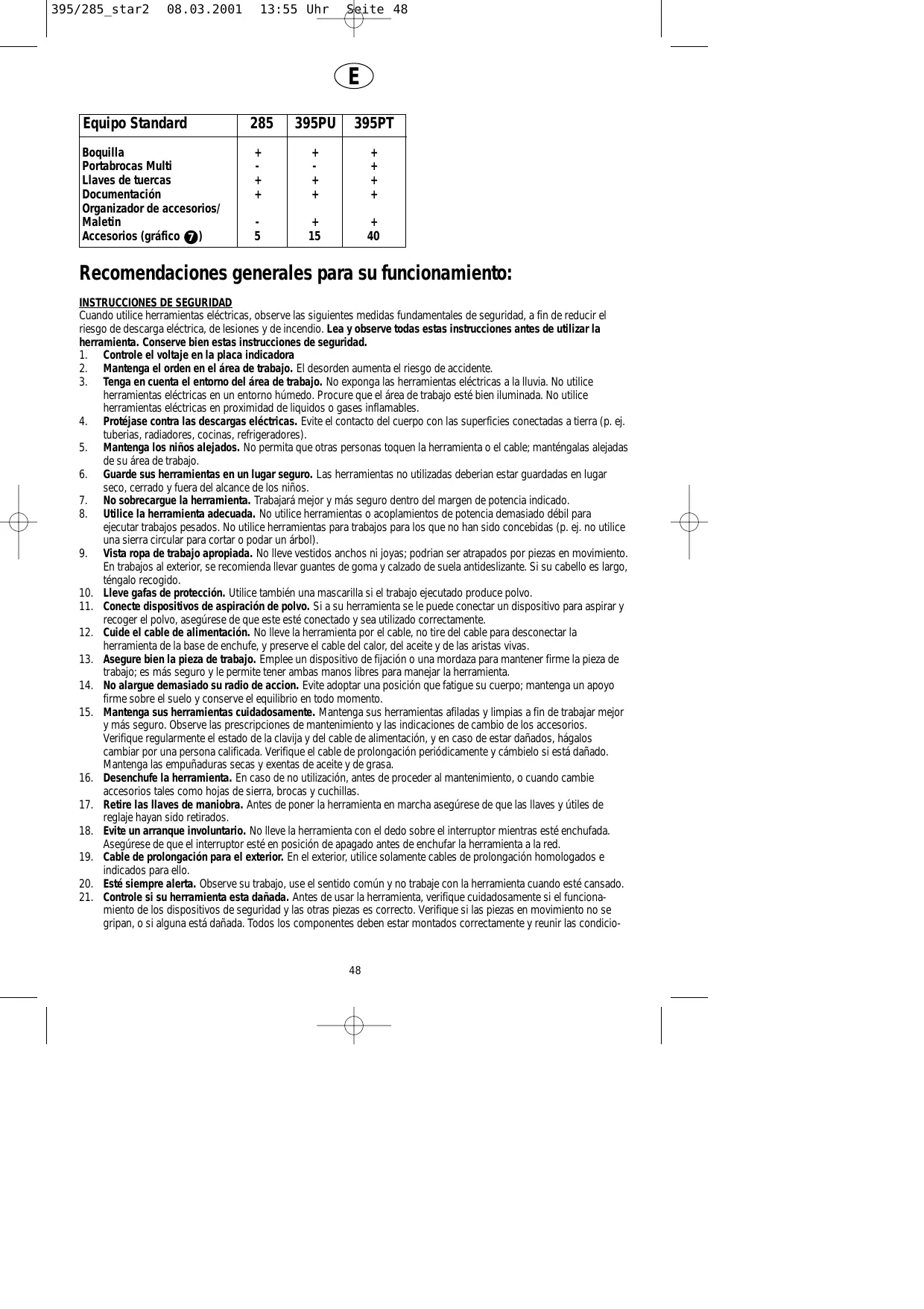 22. Atención! Utilice la herramienta y los accesorios de acuerdo con estas instrucciones de seguridad, y de manera adecuada para la herramienta en particular, teniendo en cuenta las condiciones de trabajo y el trabajo a ejecutar. Usar la herramienta en operaciones diferentes de las que realiza normalmente, podria resultar una situacion peligrosa. 23. Haga reparar su herramienta por una persona calificada. Esta herramienta eléctrica está de acuerdo con las reglas de seguridad en vigor. Toda reparación debe ser hecha por personal calificado con piezas de recambio originales, si no, puede acarrear graves riesgos para la seguridad del usario. SEGURIDAD • • • • • • • • • • • • • • • • • •