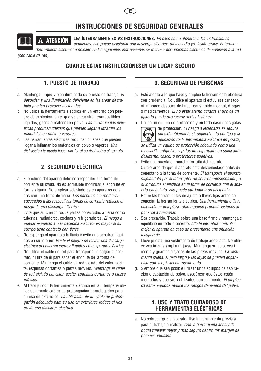 LEA ÍNTEGRAMENTE ESTAS INSTRUCCIONES. En caso de no atenerse a las instrucciones siguientes, ello puede ocasionar una descarga eléctrica, un incendio y/o lesión grave. El término "herramienta eléctrica" empleado en las siguientes instrucciones se refiere a herramientas eléctricas de conexión a la red (con cable de red). ! ATENCIÓN