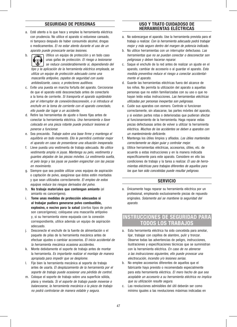INSTRUCCIONES DE SEGURIDAD PARA TODOS LOS TRABAJOS a. Esta herramienta eléctrica ha sido concebida para amolar, lijar, trabajar con cepillos de alambre, pulir y tronzar. Observe todas las advertencias de peligro, instrucciones, ilustraciones y especificaciones técnicas que se suministran con la herramienta eléctrica. En caso de no atenerse a las instrucciones siguientes, ello puede provocar una electrocución, incendio y/o lesiones serias. b. No emplee accesorios diferentes de aquellos que el fabricante haya previsto o recomendado especialmente para esta herramienta eléctrica. El mero hecho de que sea acoplable un accesorio a su herramienta eléctrica no implica que su utilización resulte segura. c. Las revoluciones admisibles del útil deberán ser como mínimo iguales a las revoluciones máximas indicadas en