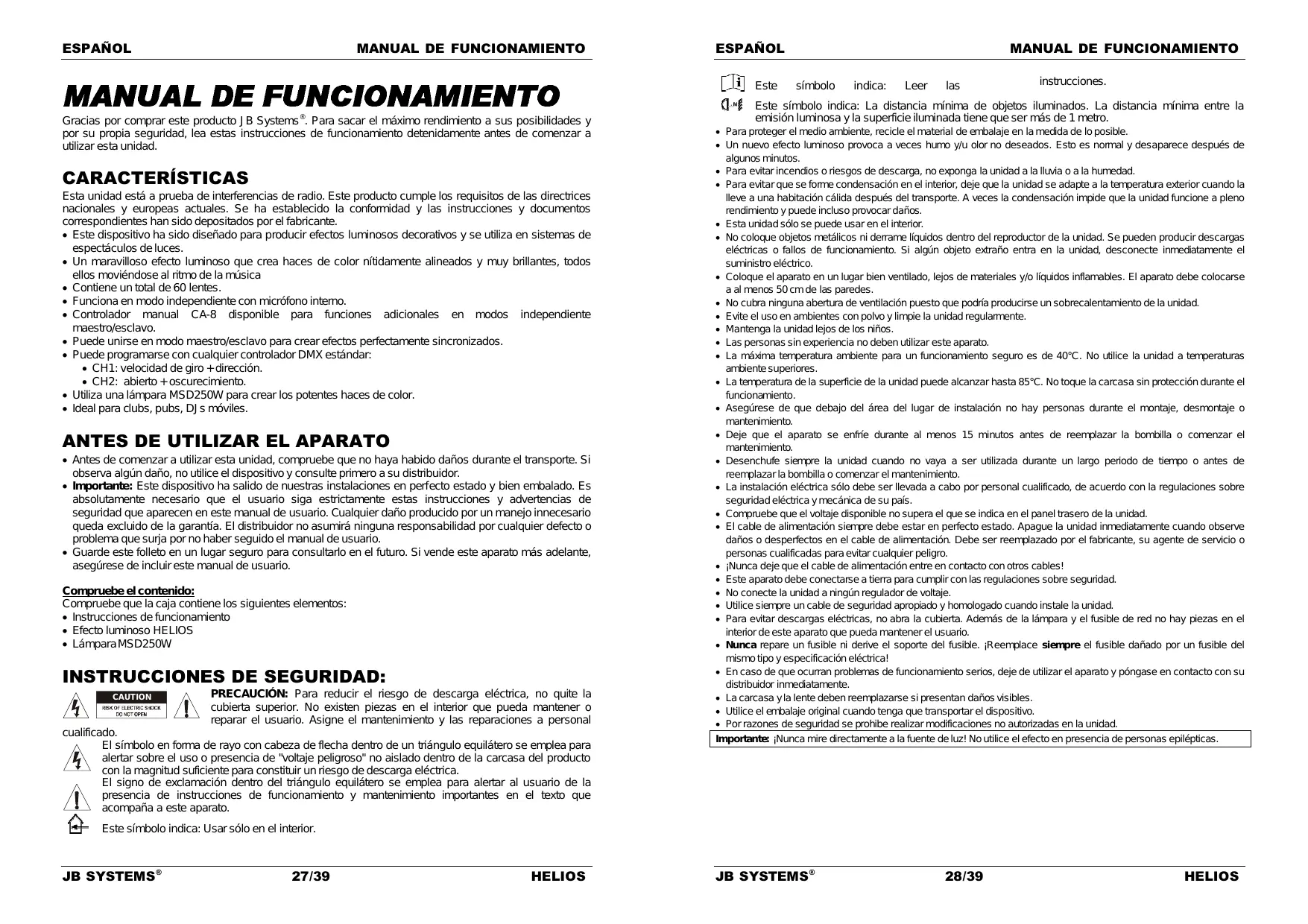 Antes de comenzar a utilizar esta unidad, compruebe que no haya habido daños durante el transporte. Si observa algún daño, no utilice el dispositivo y consulte primero a su distribuidor. Importante: Este dispositivo ha salido de nuestras instalaciones en perfecto estado y bien embalado. Es absolutamente necesario que el usuario siga estrictamente estas instrucciones y advertencias de seguridad que aparecen en este manual de usuario. Cualquier daño producido por un manejo innecesario queda excluido de la garantía. El distribuidor no asumirá ninguna responsabilidad por cualquier defecto o problema que surja por no haber seguido el manual de usuario. Guarde este folleto en un lugar seguro para consultarlo en el futuro. Si vende este aparato más adelante, asegúrese de incluir este manual de usuario. Compruebe el contenido: Compruebe que la caja contiene los siguientes elementos: Instrucciones de funcionamiento Efecto luminoso HELIOS Lámpara MSD250W INSTRUCCIONES DE SEGURIDAD: CAUTION PRECAUCIÓN: Para reducir el riesgo de descarga eléctrica, no quite la cubierta superior. No existen piezas en el interior que pueda mantener o reparar el usuario. Asigne el mantenimiento y las reparaciones a personal cualificado. El símbolo en forma de rayo con cabeza de flecha dentro de un triángulo equilátero se emplea para alertar sobre el uso o presencia de "voltaje peligroso" no aislado dentro de la carcasa del producto con la magnitud suficiente para constituir un riesgo de descarga eléctrica. El signo de exclamación dentro del triángulo equilátero se emplea para alertar al usuario de la presencia de instrucciones de funcionamiento y mantenimiento importantes en el texto que acompaña a este aparato.