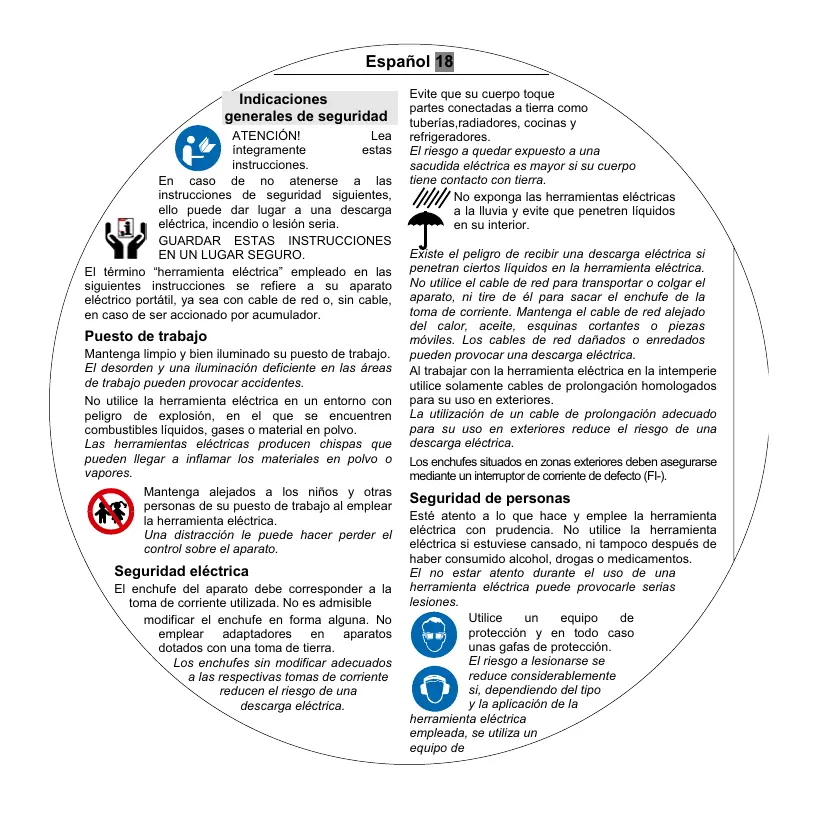 Español 18 Indicaciones generales de seguridad ATENCIÓN! Lea íntegramente estas instrucciones. En caso de no atenerse a las instrucciones de seguridad siguientes, ello puede dar lugar a una descarga eléctrica, incendio o lesión seria.