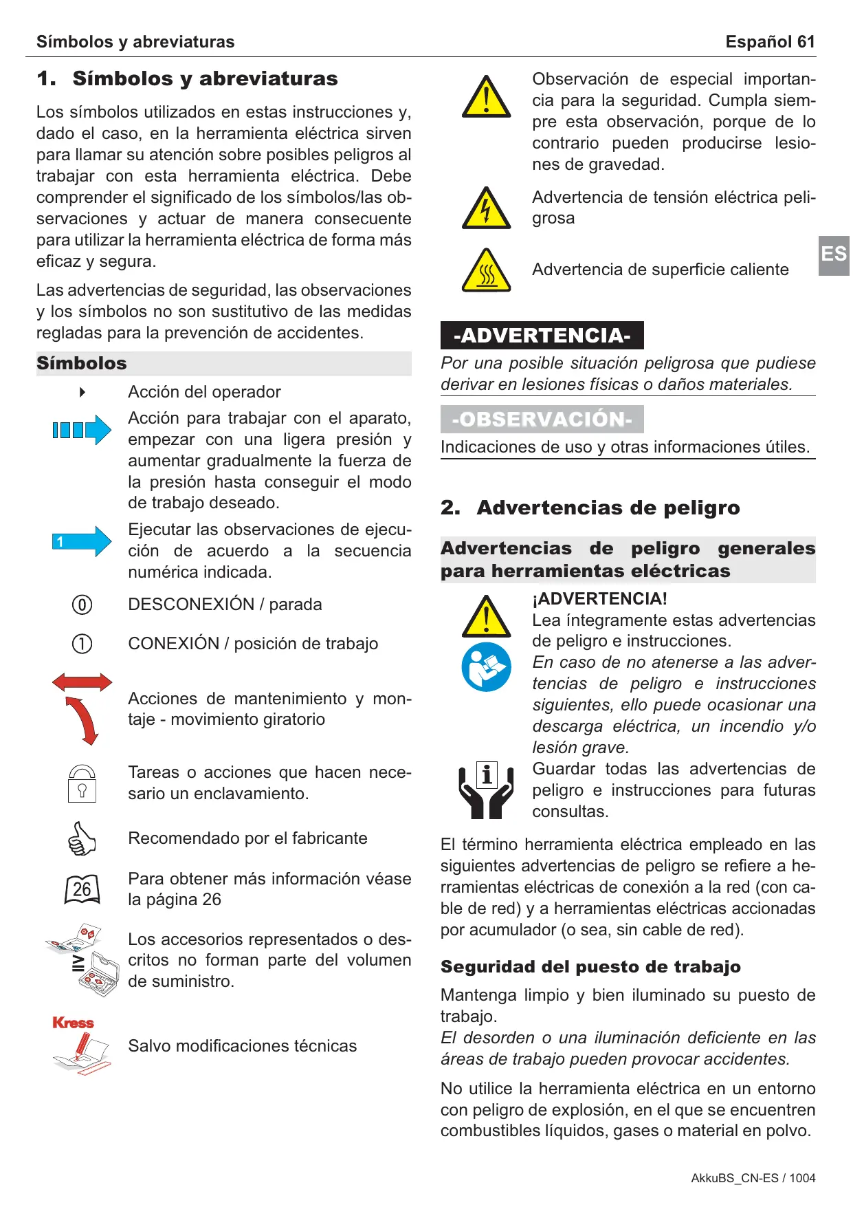 se ladea en la pieza que se está trabajando Otros riesgos. Aunque los manuales de instrucciones de nuestras herramientas incluyen indicaciones detalladas respecto al uso seguro de herramientas eléctricas, toda herramienta implica posibles riesgos que no pueden excluirse por completo ni siquiera mediante dispositivos de seguridad. Por este motivo, las herramientas eléctricas deben manejarse siempre con extrema precaución. Instrucciones de seguridad de la batería Asegure la pieza de trabajo. Una pieza de trabajo fijada con dispositivos de sujeción, o en un tornillo de banco, se mantiene sujeta de forma mucho más segura que con la mano. No utilizar baterías defectuosas o deformadas. Existe el riesgo de explosión. No trabaje rocas con ácido silícico cristalino (SiO2). Durante el trabajo se genera un polvo peligroso para la salud. No cortocircuitar nunca la batería. Existe el riesgo de explosión. No trabaje materiales que contengan amianto. El amianto es cancerígeno. Tome las medidas de protección adecuadas si al trabajar pudiera generarse polvo combustible, explosivo o nocivo para la salud. Por ejemplo: Ciertos tipos de polvo son cancerígenos. Colóquese una mascarilla antipolvo y, si su aparato viene equipado con la conexión correspondiente, utilice además un equipo de aspiración adecuado. Antes de depositarla, esperar a que se haya detenido la herramienta eléctrica. El útil puede engancharse y hacerle perder el control sobre la herramienta eléctrica. AkkuBS_CN-ES / 1004 No intente abrir el acumulador. Podría provocar un cortocircuito. Proteja el acumulador del calor y de temperaturas por encima de 50 °C como, p.ej., de una exposición prolongada al sol y del fuego. Existe el riesgo de explosión. Si el acumulador se daña o usa de forma inapropiada puede que éste emane vapores. Ventile con aire fresco el recinto y acuda a un médico si nota alguna molestia. Los vapores pueden llegar a irritar las vías respiratorias. Un acumulador defectuoso puede perder líquido y humedecer la piezas adyacentes. Examine las piezas afectadas. Límpielas, o sustitúyalas si fuese necesario. Si guarda la batería fuera del cargador cubra los contactos de la misma. Advertencias de peligro Si se produce un cortocircuito por puentear con un metal existe el riesgo de incendio y explosión. Instrucciones de seguridad del cargador No utilice el aparato eléctrico si el cable está dañado. No toque un cable dañado, y desconecte el enchufe de la red, si el cable se daña durante el trabajo. Un cable dañado comporta un mayor riesgo de electrocución. No deje funcionar el aparato eléctrico sobre una base fácilmente inflamable (p. ej. papel, textiles, etc.) ni en un entorno inflamable. Debido al calentamiento propio del aparato existe el peligro de incendio. Español 65 Preste atención a que la conexión entre el cargador y la batería esté correctamente posicionada y no obstaculizada por cuerpos extraños. Si se produce un cortocircuito por puentear con un metal existe el riesgo de incendio y explosión. Mantener el alojamiento de carga de la batería libre de objetos, y protegerlo de la suciedad y la humedad. Almacene el aparato en un lugar seco y protegido contra las heladas. Si se produce un cortocircuito existe el peligro de incendio y explosión. Si el cargador permanece conectado a la corriente eléctrica tiene que estar siempre bajo vigilancia. Existe el peligro de incendio. No exponga el aparato eléctrico a la lluvia ni a la humedad. La penetración de agua en el aparato eléctrico aumenta el riesgo de electrocución. No cubrir las rejillas de ventilación del cargador durante el proceso de carga. Sirven para evitar el sobrecalentamiento del cargador y de la batería. No cargue acumuladores de otras marcas. El aparato eléctrico solamente es adecuado para cargar acumuladores KRESS. En caso de no atenerse a ello puede provocarse un incendio o explosión. Mantenga limpio el aparato eléctrico. La suciedad puede comportar un riesgo de electrocución. Antes de cada utilización verificar el estado del aparato eléctrico, cable y enchufe. No utilice el aparato eléctrico en caso de detectar algún desperfecto. Jamás intente abrir el aparato eléctrico por su propia cuenta, y solamente hágalo reparar por personal técnico cualificado empleando exclusivamente piezas de repuesto originales. Un aparato eléctrico, cable y enchufe deteriorado comportan un mayor riesgo de electrocución. -ADVERTENCIANo abrir el cargador. Atención, alta tensión. Existe el peligro de una descarga eléctrica. AkkuBS_CN-ES / 1004 66 Español Descripción del aparato