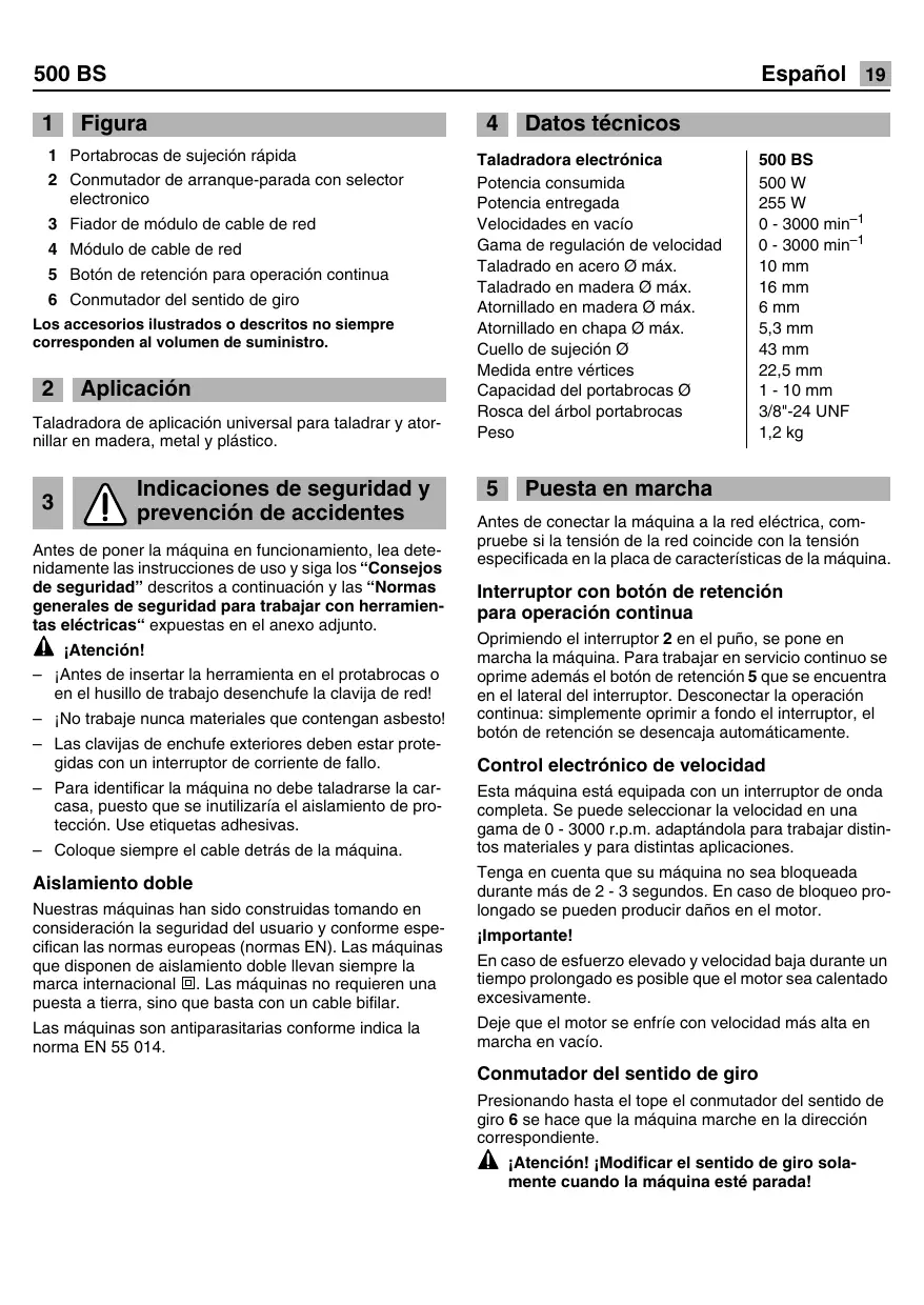 Los accesorios ilustrados o descritos no siempre corresponden al volumen de suministro. 2 Aplicaciôn Taladradora de aplicaciôn universal para taladrar y ator- nillar en madera, metal y pléstico. 3 Indicaciones de seguridad y N prevenciôn de accidentes Antes de poner la méquina en funcionamiento, lea dete- nidamente las instrucciones de uso y siga los “Consejos de seguridad” descritos a continuacién y las “Normas generales de seguridad para trabajar con herramien- tas eléctricas“ expuestas en el anexo adjunto. À iAtencién! —_ jAntes de insertar la herramienta en el protabrocas o en el husillo de trabajo desenchufe la clavija de red! —_ iNo trabaje nunca materiales que contengan asbestol — Las clavijas de enchufe exteriores deben estar prote- gidas con un interruptor de corriente de fallo. — Para identificar la mäquina no debe taladrarse la car- casa, puesto que se inutilizaria el aislamiento de pro- tecciôn. Use etiquetas adhesivas. — Coloque siempre el cable deträs de la mäquina. Aislamiento doble Nuestras méquinas han sido construidas tomando en consideraciôn la seguridad del usuario y conforme espe- cifican las normas europeas (normas EN). Las méquinas que disponen de aislamiento doble Ilevan siempre la marca internacional El. Las mäquinas no requieren una puesta a tierra, sino que basta con un cable bifilar. Las mquinas son antiparasitarias conforme indica la norma EN 55 014. 4 Datos técnicos Taladradora electrénica 500 BS Potencia consumida 500 W Potencia entregada 255 W Velocidades en vacio 0 - 3000 min Gama de regulaciôn de velocidad | O - 3000 min! Taladrado en acero © méx. 10 mm Taladrado en madera © mäx. 16 mm Atornillado en madera © mäx. 6mm Atornillado en chapa © mäx. 5,3mm Cuello de sujeciôn @ 43 mm Medida entre vértices 22,5 mm Capacidad del portabrocas © 1-10 mm Rosca del érbol portabrocas 3/8"-24 UNF Peso 12kg 5 Puesta en marcha Antes de conectar la méquina a la red eléctrica, com- pruebe si la tensiôn de la red coincide con la tensiôn especificada en la placa de caracteristicas de la mäquina. Interruptor con botén de retenciôn para operaciôn continua Oprimiendo el interruptor 2 en el puño, se pone en marcha la méquina. Para trabajar en servicio continuo se oprime ademés el botôn de retenciôn 5 que se encuentra en el lateral del interruptor. Desconectar la operaciôn continua: simplemente oprimir a fondo el interruptor, el botén de retenciôn se desencaja autométicamente. Control electrénico de velocidad Esta mâquina esté equipada con un interruptor de onda completa. Se puede seleccionar la velocidad en una gama de O - 3000 r.p.m. adaptändola para trabajar distin- tos materiales y para distintas aplicaciones. Tenga en cuenta que su mâquina no sea bloqueada durante més de 2 - 3 segundos. En caso de bloqueo pro- longado se pueden producir daños en el motor. importante! En caso de esfuerzo elevado y velocidad baja durante un tiempo prolongado es posible que el motor sea calentado excesivamente. Deje que el motor se enfrie con velocidad més alta en marcha en vacio. Conmutador del sentido de giro Presionando hasta el tope el conmutador del sentido de giro 6 se hace que la mäquina marche en la direcciôn correspondiente. À iAtencién! Modificar el sentido de giro sola- mente cuando la mâquina esté parada!