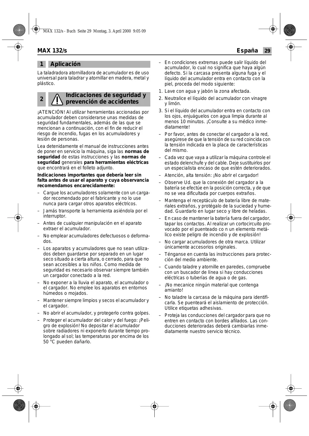 Indicaciones de seguridad y prevención de accidentes ¡ATENCIÓN! Al utilizar herramientas accionadas por acumulador deben considerarse unas medidas de seguridad fundamentales, además de las que se mencionan a continuación, con el fin de reducir el riesgo de incendio, fugas en los acumuladores y lesión de personas. Lea detenidamente el manual de instrucciones antes de poner en servicio la máquina, siga las normas de seguridad de estas instrucciones y las normas de seguridad generales para herramientas eléctricas que encontrará en el folleto adjunto. Indicaciones importantes que debería leer sin falta antes de usar el aparato y cuya observancia recomendamos encarecidamente: – Cargue los acumuladores solamente con un cargador recomendado por el fabricante y no lo use nunca para cargar otros aparatos eléctricos. – Jamás transporte la herramienta asiéndola por el interruptor. – Antes de cualquier manipulación en el aparato extraer el acumulador. – No emplear acumuladores defectuosos o deformados. – Los aparatos y acumuladores que no sean utilizados deben guardarse por separado en un lugar seco situado a cierta altura, o cerrado, para que no sean accesibles a los niños. Como medida de seguridad es necesario observar siempre también un cargador conectado a la red. – No exponer a la lluvia el aparato, el acumulador o el cargador. No emplee los aparatos en entornos húmedos o mojados. – Mantener siempre limpios y secos el acumulador y el cargador. – No abrir el acumulador, y protegerlo contra golpes. – Proteger el acumulador del calor y del fuego: ¡Peligro de explosión! No depositar el acumulador sobre radiadores ni exponerlo durante tiempo prolongado al sol; las temperaturas por encima de los 50 °C pueden dañarlo. España