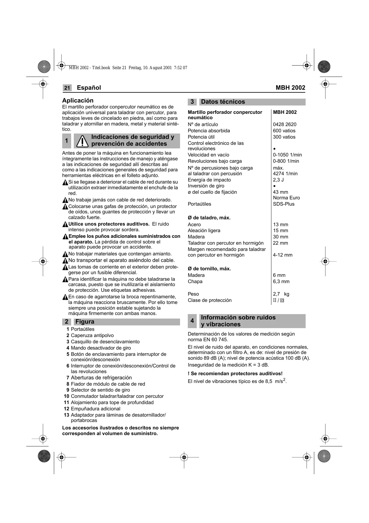 Figura Portaútiles Caperuza antipolvo Casquillo de desenclavamiento Mando desactivador de giro Botón de enclavamiento para interruptor de conexión/desconexión 6 Interruptor de conexión/desconexión/Control de las revoluciones 7 Aberturas de refrigeración 8 Fiador de módulo de cable de red 9 Selector de sentido de giro 10 Conmutador taladrar/taladrar con percutor 11 Alojamiento para tope de profundidad 12 Empuñadura adicional 13 Adaptador para láminas de desatornillador/ portabrocas Los accesorios ilustrados o descritos no siempre corresponden al volumen de suministro. MBH 2002