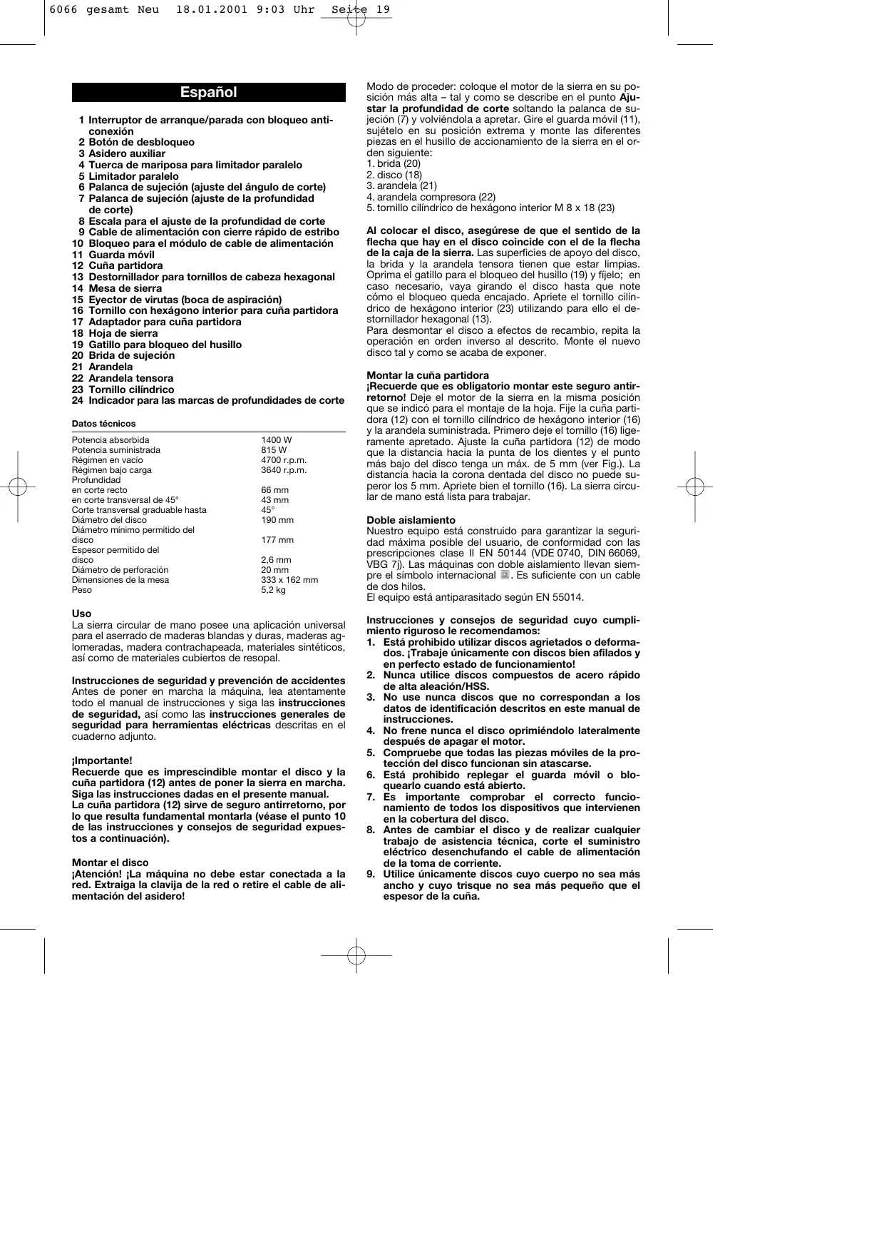 Puede puentear el aislamiento de protección. Utilice placas adhesivas. Puesta en servicio Antes de conectar la sierra a la red eléctrica le rogamos que compruebe si la tensión de la red eléctrica coincide con la tensión especificada en la placa de características de la máquina. Interruptor de arranque/parada con bloqueo anticonexión Antes de accionar el interruptor (1) situado en el asidero hay que liberarlo oprimiendo el botón de desbloqueo (2). La máquina no se enciende hasta que no esté oprimido el interruptor. Por motivos de seguridad resulta imposible asegurar el interruptor para trabajar en servicio continuo. Al soltar el interruptor, el suministro de corriente se corta y la máquina se para. El bloqueo anticonexión paraliza automáticamente el interruptor e impide que la máquina se encienda de forma inesperada. Motor Este potente motor universal dispone de suficientes reservas. Su enfriamiento está garantizado por un ventilador de grandes dimensiones. ¡Sometido a un fuerte esfuerzo permanente, el motor puede llegar a calentarse en exceso! ¡Déjelo enfriar en ralentí! ¡Trabaje únicamente con discos afilados de buena calidad para prevenir un calentamiento excesivo del motor! Mantenimiento y limpieza La limpieza del polvo acumulado en los orificios de ventilación que hay en la caja del motor es algo que el motor le agradecerá compensándole con una larga vida útil, pues la ventilación adecuada es fundamental para la máquina. Limpie periódicamente los restos de resina acumulados en el eyector de virutas (no utilice disolventes fuertes). Para que éstas salgan sin dificultad. El motor de la máquina cuenta con una lubricación permanente y, por lo demás, no requiere mantenimiento alguno. No obstante, si utiliza la máquina durante un largo período de tiempo, le recomendamos enviarla a nuestro centro de asistencia técnica para someterla a una limpieza profunda y a una inspección adecuada. Ello le ahorrará gastos de reparación innecesarios y le ayudará a prolongar la vida útil de la máquina. Mesa La mesa (14) sale montada de fábrica con un ángulo exacto de 90° entre la mesa y el disco en la posición básica (posición cero). La suspensión de 4 puntos garantiza un trabajo preciso. Guarda móvil El guarda móvil (11) que cubre el disco retrocede automáticamente al pegar la sierra a la pieza, haciéndolo a la misma velocidad que se mueve la sierra al trabajar. Al concluir el trabajo de corte retorna a la posición de seguridad accionado por un muelle. Ajustar la profundidad de corte La profundidad de corte se ajusta en una escala que llega hasta 66 mm. La mesa (14) se puede bajar para ajustar la profundidad de corte «0», soltando la palanca de sujeción (7) en la corcasa. La profundidad de corte puede regularse según escala en el indicador de marcas. Se recomienda adaptar siempre la profundidad de corte (24) al espesor de la pieza; es decir, asegúrese de que el disco sobresale del material como máximo la medida de un diente. ¡Importante para prevenir accidentes! Cortar por trazado La sierra circular está equipada con un marcador regulable (entaladura) para cortes de ángulo derecho (posición cero) y que se ajusta al espesor del disco. Además hay unas marcaciones para cortes inclinados de 0° y 45°, de forma que se pueda trabajar con precisión y sencillez. La entaladura integrada en la mesa de corte correspond asimismo al espesor de corte del disco. Si corta según una fisura superficial, concéntrese en el canto derecho o izquierdo de la entaladura dependiendo de si realiza el corte a la derecha o a la izquierda de la fisura. Limitador paralelo El limitador paralelo es muy fácil de ajustar mediante la escala que tiene. Aflojar la tuerca de mariposa (4), desplazar el limitador paralelo (5) hasta la medida deseada. Apretar la tuerca de mariposa (4). Ajustar el ángulo de corte La mesa (14) puede girarse hasta una inclinación de corte de 45°. Suelte ambas palancas de sujeción (6) en los cuadrantes graduados, incline la mesa según escala y fije de nuevo la palanca de sujeción. La pieza angulada en el cuadrante angular indica la marcación en la mesa de corte para la regulación de 0°. 6066 gesamt Neu