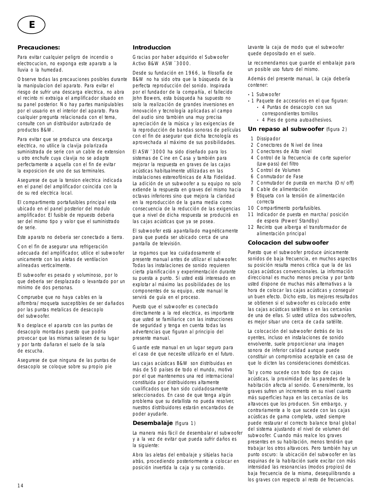 B&W no ha sido otra que la búsqueda de la perfecta reproducción del sonido. Inspirada por el fundador de la compañía, el fallecido John Bowers, esta búsqueda ha supuesto no solo la realización de grandes inversiones en innovación y tecnología aplicadas al campo del audio sino también una muy precisa apreciación de la música y las exigencias de la reproducción de bandas sonoras de películas con el fin de asegurar que dicha tecnología es aprovechada al máximo de sus posibilidades. El ASW™3000 ha sido diseñado para los sistemas de Cine en Casa y también para mejorar la respuesta en graves de las cajas acústicas habitualmente utilizadas en las instalaciones estereofónicas de Alta Fidelidad. La adición de un subwoofer a su equipo no solo extiende la respuesta en graves del mismo hacia octavas inferiores sino que mejora la claridad en la reproducción de la gama media como consecuencia de la reducción de las exigencias que a nivel de dicha respuesta se producirá en las cajas acústicas que ya se posea. El subwoofer está apantallado magnéticamente para que pueda ser ubicado cerca de una pantalla de televisión. Le rogamos que lea cuidadosamente el presente manual antes de utilizar el subwoofer. Todas las instalaciones de sonido requieren cierta planificación y experimentación durante su puesta a punto. Si usted está interesado en explotar al máximo las posibilidades de los componentes de su equipo, este manual le servirá de guía en el proceso. Puesto que el subwoofer es conectado directamente a la red electrica, es importante que usted se familiarice con las instrucciones de seguridad y tenga en cuenta todas las advertencias que figuran al principio del presente manual. Guarde este manual en un lugar seguro para el caso de que necesite utilizarlo en el futuro. Las cajas acústicas B&W son distribuidas en más de 50 países de todo el mundo, motivo por el que mantenemos una red internacional constituida por distribuidores altamente cualificados que han sido cuidadosamente seleccionados. En caso de que tenga algún problema que su detallista no pueda resolver, nuestros distribuidores estarán encantados de poder ayudarle.