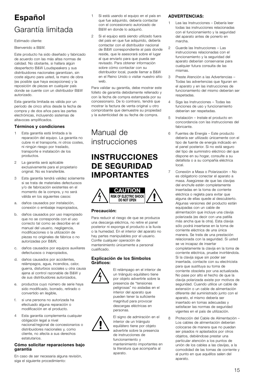 Garantía limitada 2 Estimado cliente: Bienvenido a B&W. Este producto ha sido diseñado y fabricado de acuerdo con las más altas normas de calidad. No obstante, si hallara algún desperfecto B&W Loudspeakers y sus distribuidores nacionales garantizan, sin coste alguno para usted, la mano de obra (es posible que haya excepciones) y la reposición de piezas en cualquier país donde se cuente con un distribuidor B&W autorizado. Esta garantía limitada es válida por un período de cinco años desde la fecha de compra y de dos años para las partes electrónicas, incluyendo sistemas de altavoces amplificados.