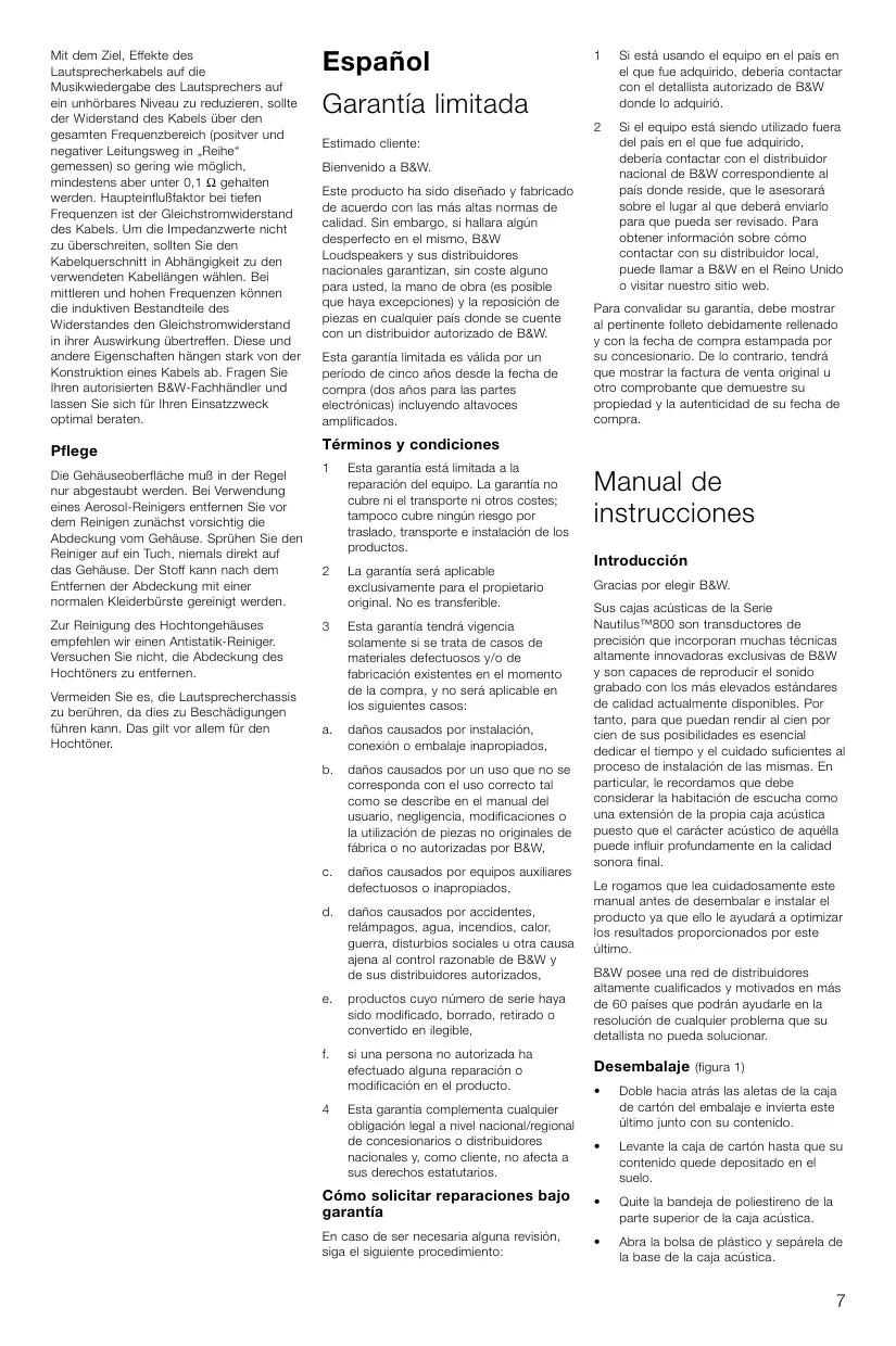 Garantía limitada Estimado cliente: Bienvenido a B&W. Este producto ha sido diseñado y fabricado de acuerdo con las más altas normas de calidad. Sin embargo, si hallara algún desperfecto en el mismo, B&W Loudspeakers y sus distribuidores nacionales garantizan, sin coste alguno para usted, la mano de obra (es posible que haya excepciones) y la reposición de piezas en cualquier país donde se cuente con un distribuidor autorizado de B&W. Esta garantía limitada es válida por un período de cinco años desde la fecha de compra (dos años para las partes electrónicas) incluyendo altavoces amplificados.