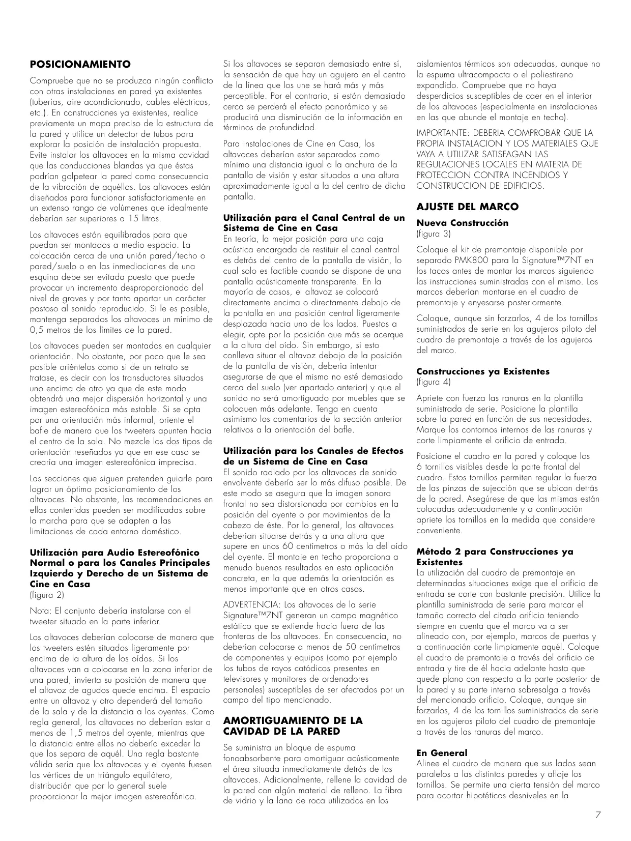 AJUSTE DEL MARCO Utilización para el Canal Central de un Sistema de Cine en Casa En teoría, la mejor posición para una caja acústica encargada de restituir el canal central es detrás del centro de la pantalla de visión, lo cual solo es factible cuando se dispone de una pantalla acústicamente transparente. En la mayoría de casos, el altavoz se colocará directamente encima o directamente debajo de la pantalla en una posición central ligeramente desplazada hacia uno de los lados. Puestos a elegir, opte por la posición que más se acerque a la altura del oído. Sin embargo, si esto conlleva situar el altavoz debajo de la posición de la pantalla de visión, debería intentar asegurarse de que el mismo no esté demasiado cerca del suelo (ver apartado anterior) y que el sonido no será amortiguado por muebles que se coloquen más adelante. Tenga en cuenta asímismo los comentarios de la sección anterior relativos a la orientación del bafle. Utilización para los Canales de Efectos de un Sistema de Cine en Casa El sonido radiado por los altavoces de sonido envolvente debería ser lo más difuso posible. De este modo se asegura que la imagen sonora frontal no sea distorsionada por cambios en la posición del oyente o por movimientos de la cabeza de éste. Por lo general, los altavoces deberían situarse detrás y a una altura que supere en unos 60 centímetros o más la del oído del oyente. El montaje en techo proporciona a menudo buenos resultados en esta aplicación concreta, en la que además la orientación es menos importante que en otros casos. ADVERTENCIA: Los altavoces de la serie Signature™7NT generan un campo magnético estático que se extiende hacia fuera de las fronteras de los altavoces. En consecuencia, no deberían colocarse a menos de 50 centímetros de componentes y equipos (como por ejemplo los tubos de rayos catódicos presentes en televisores y monitores de ordenadores personales) susceptibles de ser afectados por un campo del tipo mencionado.