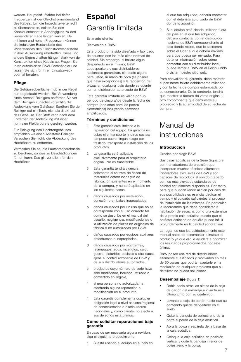 Bienvenido a B&W. Este producto ha sido diseñado y fabricado de acuerdo con las más altas normas de calidad. Sin embargo, si hallara algún desperfecto en el mismo, B&W Loudspeakers y sus distribuidores nacionales garantizan, sin coste alguno para usted, la mano de obra (es posible que haya excepciones) y la reposición de piezas en cualquier país donde se cuente con un distribuidor autorizado de B&W. Esta garantía limitada es válida por un período de cinco años desde la fecha de compra (dos años para las partes electrónicas) incluyendo altavoces amplificados.