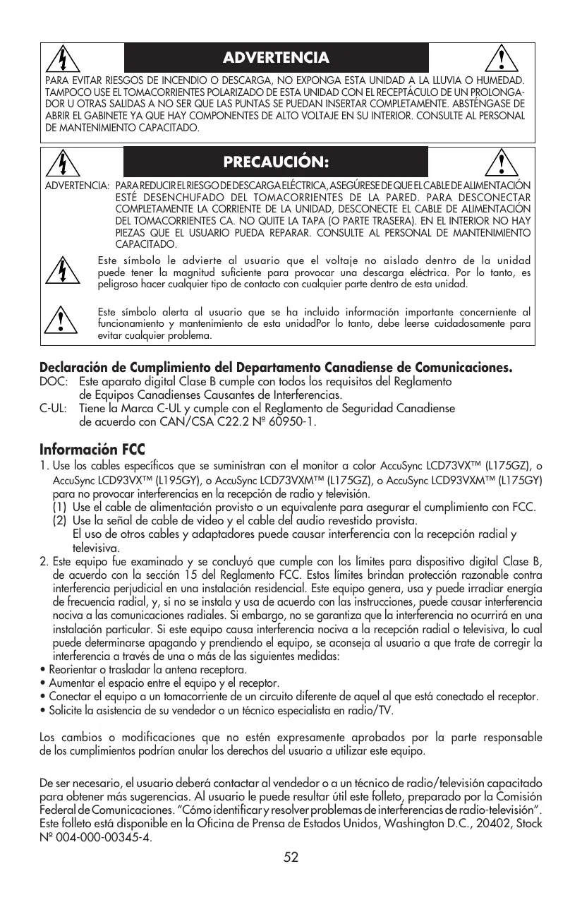- Use los cables espécíficos que se suministran con el monitor a color AccuSync LCD73VXTM (L175GZ), o AccuSync LCD93VXTM (L195GY), o AccuSync LCD73VXMTM (L175GZ), o AccuSync LCD93VXMTM (L175GY) para no provocar interferencias en la recepción de radio y television.