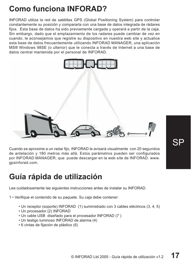 Como funciona INFORAD? INFORAD utiliza la red de satélites GPS (Global Positioning System) para controlar constantemente su posición y compararla con una base de datos integrada de rádares fijos. Esta base de datos ha sido previamente cargada y operará a partir de la caja. Sin embargo, dado que el emplazamiento de los radares puede cambiar de vez en cuando, le aconsejamos que registre su dispositivo en nuestra web site y actualice esta base de datos frecuentemente utilizando INFORAD MANAGER, una aplicación MS® Windows 98SE (o ulterior) que le conecta a través de Internet a una base de datos central mantenida por el personal de INFORAD. Cuando se aproxime a un radar fijo, INFORAD le avisará visualmente con 20 segundos de antelación y 180 metros más allá. Estos parámetros pueden ser configurados por INFORAD MANAGER, que puede descargar en la web site de INFORAD. www. gpsinforad.com.