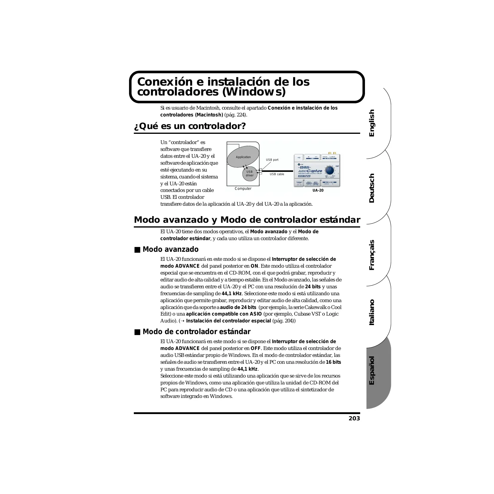 Conexión e instalación de los controladores (Windows) English Si es usuario de Macintosh, consulte el apartado Conexión e instalación de los controladores (Macintosh) (pág. 224). ¿Qué es un controlador? fig.05-1e_50 Deutsch Un “controlador” es software que transfiere datos entre el UA-20 y el Application USB port software de aplicación que esté ejecutando en su USB USB cable driver sistema, cuando el sistema y el UA-20 están Computer UA-20 conectados por un cable USB. El controlador transfiere datos de la aplicación al UA-20 y del UA-20 a la aplicación. Modo avanzado y Modo de controlador estándar Français El UA-20 tiene dos modos operativos, el Modo avanzado y el Modo de controlador estándar, y cada uno utiliza un controlador diferente. ■ Modo avanzado Italiano El UA-20 funcionará en este modo si se dispone el Interruptor de selección de modo ADVANCE del panel posterior en ON. Este modo utiliza el controlador especial que se encuentra en el CD-ROM, con el que podrá grabar, reproducir y editar audio de alta calidad y a tiempo estable. En el Modo avanzado, las señales de audio se transfieren entre el UA-20 y el PC con una resolución de 24 bits y unas frecuencias de sampling de 44,1 kHz. Seleccione este modo si está utilizando una aplicación que permite grabar, reproducir y editar audio de alta calidad, como una aplicación que da soporte a audio de 24 bits (por ejemplo, la serie Cakewalk o Cool Edit) o una aplicación compatible con ASIO (por ejemplo, Cubase VST o Logic Audio). (➝ Instalación del controlador especial (pág. 204)) ■ Modo de controlador estándar Español El UA-20 funcionará en este modo si se dispone el Interruptor de selección de modo ADVANCE del panel posterior en OFF. Este modo utiliza el controlador de audio USB estándar propio de Windows. En el modo de controlador estándar, las señales de audio se transfieren entre el UA-20 y el PC con una resolución de 16 bits y unas frecuencias de sampling de 44,1 kHz. Seleccione este modo si está utilizando una aplicación que se sirve de los recursos propios de Windows, como una aplicación que utiliza la unidad de CD-ROM del PC para reproducir audio de CD o una aplicación que utiliza el sintetizador de software integrado en Windows.