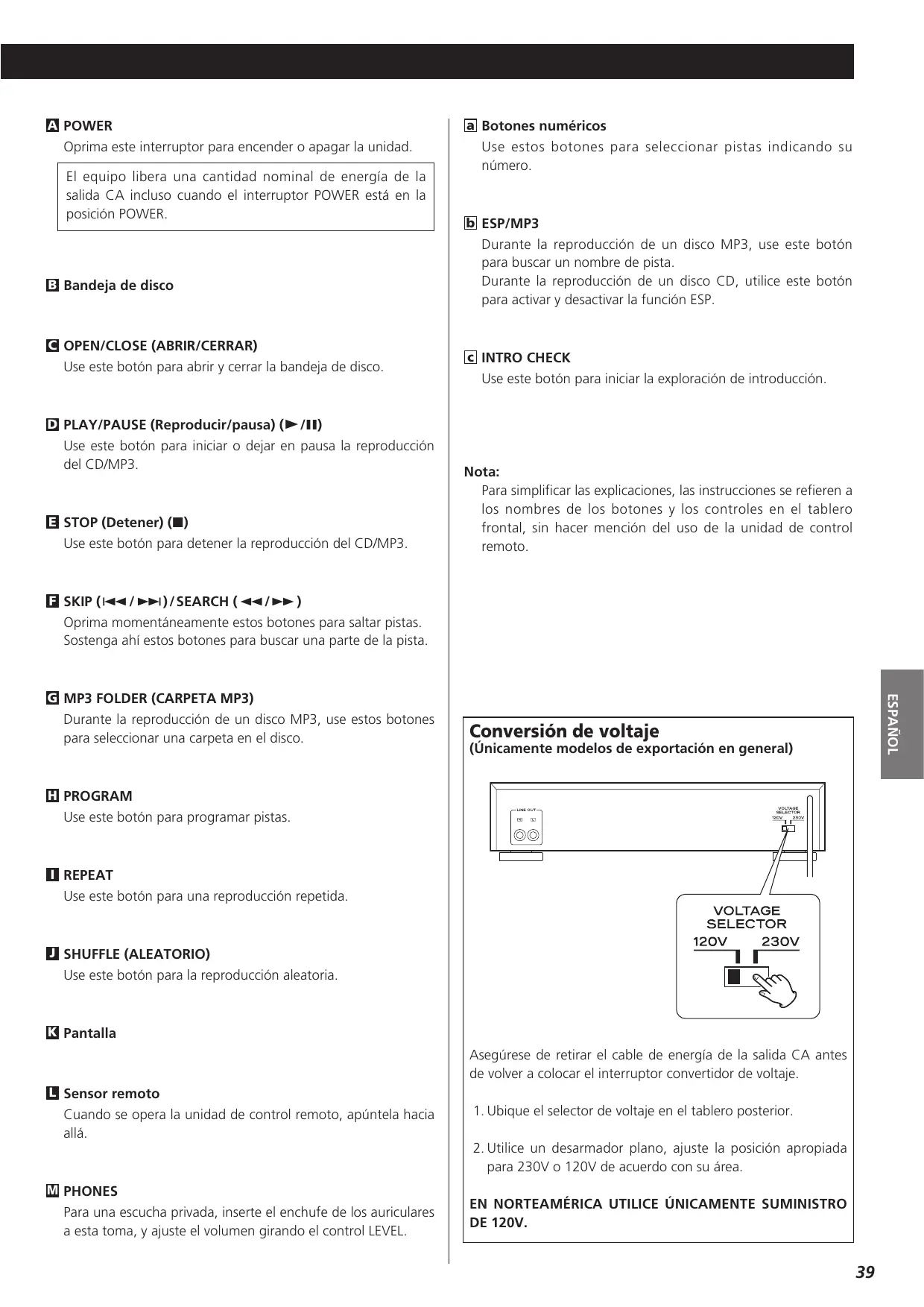 A POWER Oprima este interruptor para encender o apagar la unidad. El equipo libera una cantidad nominal de energía de la salida CA incluso cuando el interruptor POWER está en la posición POWER. B Bandeja de disco C OPEN/CLOSE (ABRIR/CERRAR) Use este botón para abrir y cerrar la bandeja de disco. a Botones numéricos Use estos botones para seleccionar pistas indicando su número. b ESP/MP3 Durante la reproducción de un disco MP3, use este botón para buscar un nombre de pista. Durante la reproducción de un disco CD, utilice este botón para activar y desactivar la función ESP. c INTRO CHECK Use este botón para iniciar la exploración de introducción. D PLAY/PAUSE (Reproducir/pausa) (y/J) Use este botón para iniciar o dejar en pausa la reproducción del CD/MP3. E STOP (Detener) (H) Use este botón para detener la reproducción del CD/MP3. Nota: Para simplificar las explicaciones, las instrucciones se refieren a los nombres de los botones y los controles en el tablero frontal, sin hacer mención del uso de la unidad de control remoto. F SKIP (.//) / SEARCH (m/,) Oprima momentáneamente estos botones para saltar pistas. Sostenga ahí estos botones para buscar una parte de la pista. Durante la reproducción de un disco MP3, use estos botones para seleccionar una carpeta en el disco. ESPAÑOL G MP3 FOLDER (CARPETA MP3) Conversión de voltaje (Únicamente modelos de exportación en general) H PROGRAM Use este botón para programar pistas. I REPEAT Use este botón para una reproducción repetida. J SHUFFLE (ALEATORIO) Use este botón para la reproducción aleatoria. K Pantalla Asegúrese de retirar el cable de energía de la salida CA antes de volver a colocar el interruptor convertidor de voltaje. L Sensor remoto Cuando se opera la unidad de control remoto, apúntela hacia allá.