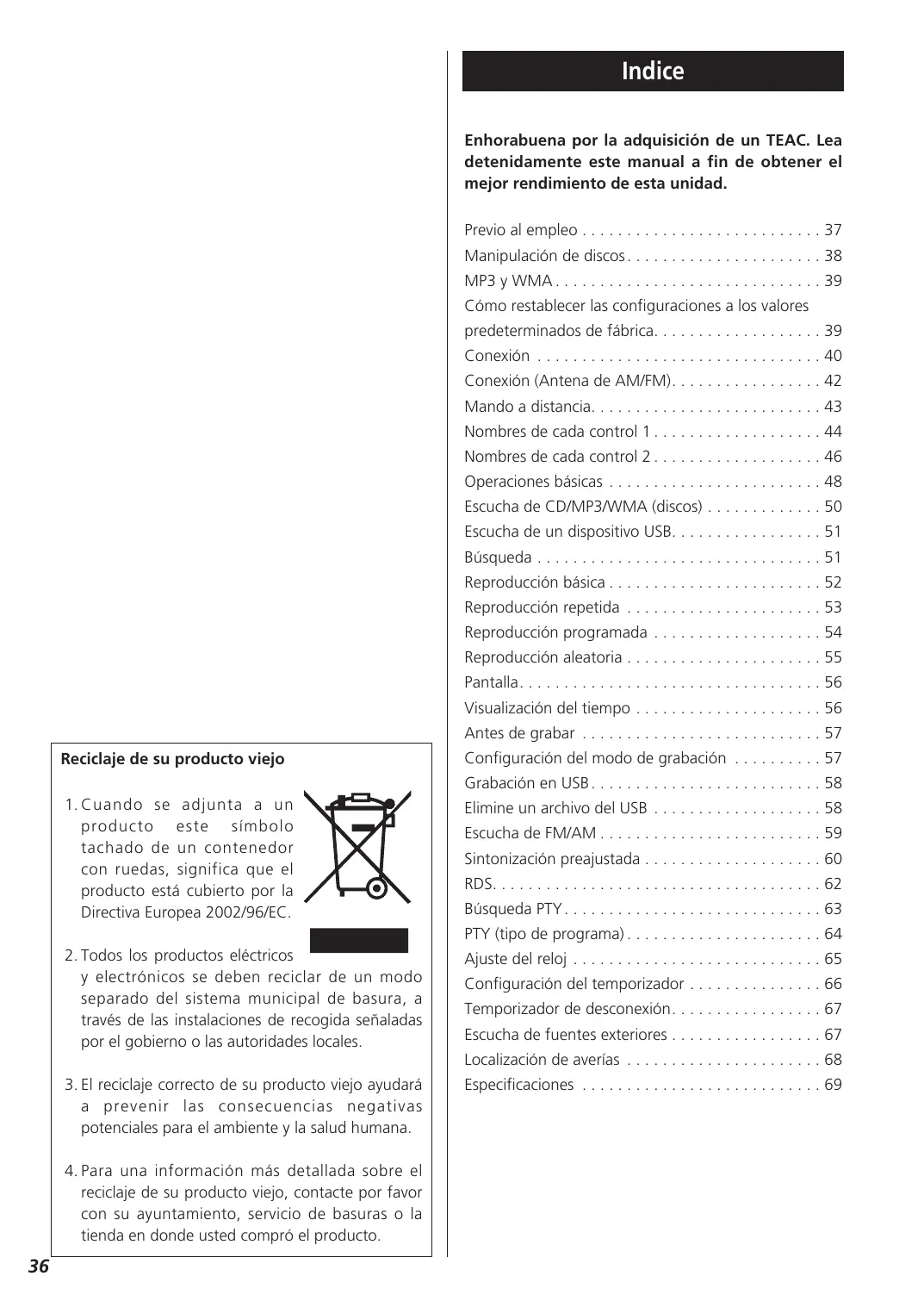 Indice Enhorabuena por la adquisición de un TEAC. Lea detenidamente este manual a fin de obtener el mejor rendimiento de esta unidad. Previo al empleo . . . . . . . . . . . . . . . . . . . . . . . . . . . 37 Manipulación de discos . . . . . . . . . . . . . . . . . . . . . . 38 MP3 y WMA . . . . . . . . . . . . . . . . . . . . . . . . . . . . . . 39 Cómo restablecer las configuraciones a los valores predeterminados de fábrica. . . . . . . . . . . . . . . . . . . 39 Conexión . . . . . . . . . . . . . . . . . . . . . . . . . . . . . . . . 40 Conexión (Antena de AM/FM). . . . . . . . . . . . . . . . . 42 Mando a distancia. . . . . . . . . . . . . . . . . . . . . . . . . . 43 Nombres de cada control 1 . . . . . . . . . . . . . . . . . . . 44 Nombres de cada control 2 . . . . . . . . . . . . . . . . . . . 46 Operaciones básicas . . . . . . . . . . . . . . . . . . . . . . . . 48 Escucha de CD/MP3/WMA (discos) . . . . . . . . . . . . . 50 Escucha de un dispositivo USB. . . . . . . . . . . . . . . . . 51 Búsqueda . . . . . . . . . . . . . . . . . . . . . . . . . . . . . . . . 51 Reproducción básica . . . . . . . . . . . . . . . . . . . . . . . . 52 Reproducción repetida . . . . . . . . . . . . . . . . . . . . . . 53 Reproducción programada . . . . . . . . . . . . . . . . . . . 54 Reproducción aleatoria . . . . . . . . . . . . . . . . . . . . . . 55 Pantalla. . . . . . . . . . . . . . . . . . . . . . . . . . . . . . . . . . 56 Visualización del tiempo . . . . . . . . . . . . . . . . . . . . . 56 Antes de grabar . . . . . . . . . . . . . . . . . . . . . . . . . . . 57 Reciclaje de su producto viejo
