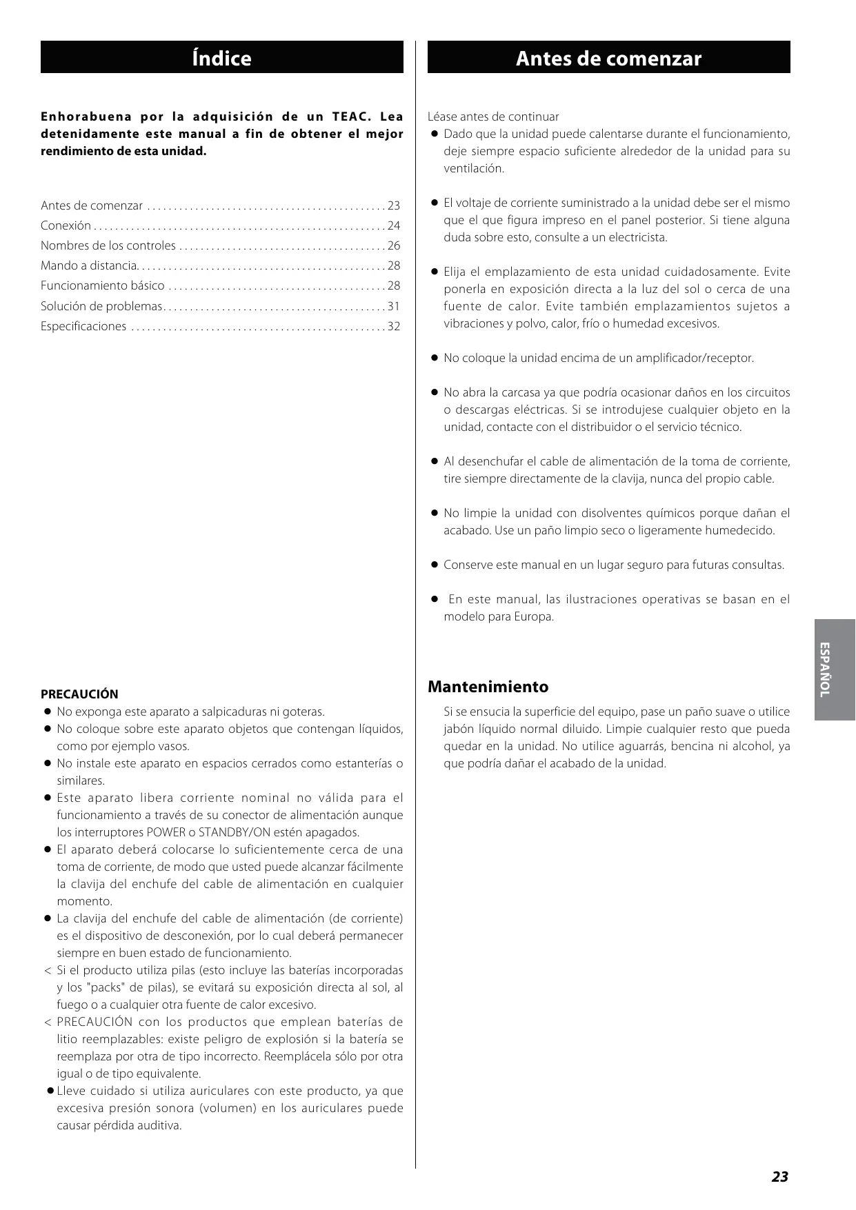 Enhorab u e n a po r l a ad q u i s i c i ón d e u n T EA C . L ea detenidamente este manual a fin de obtener el mejor rendimiento de esta unidad.