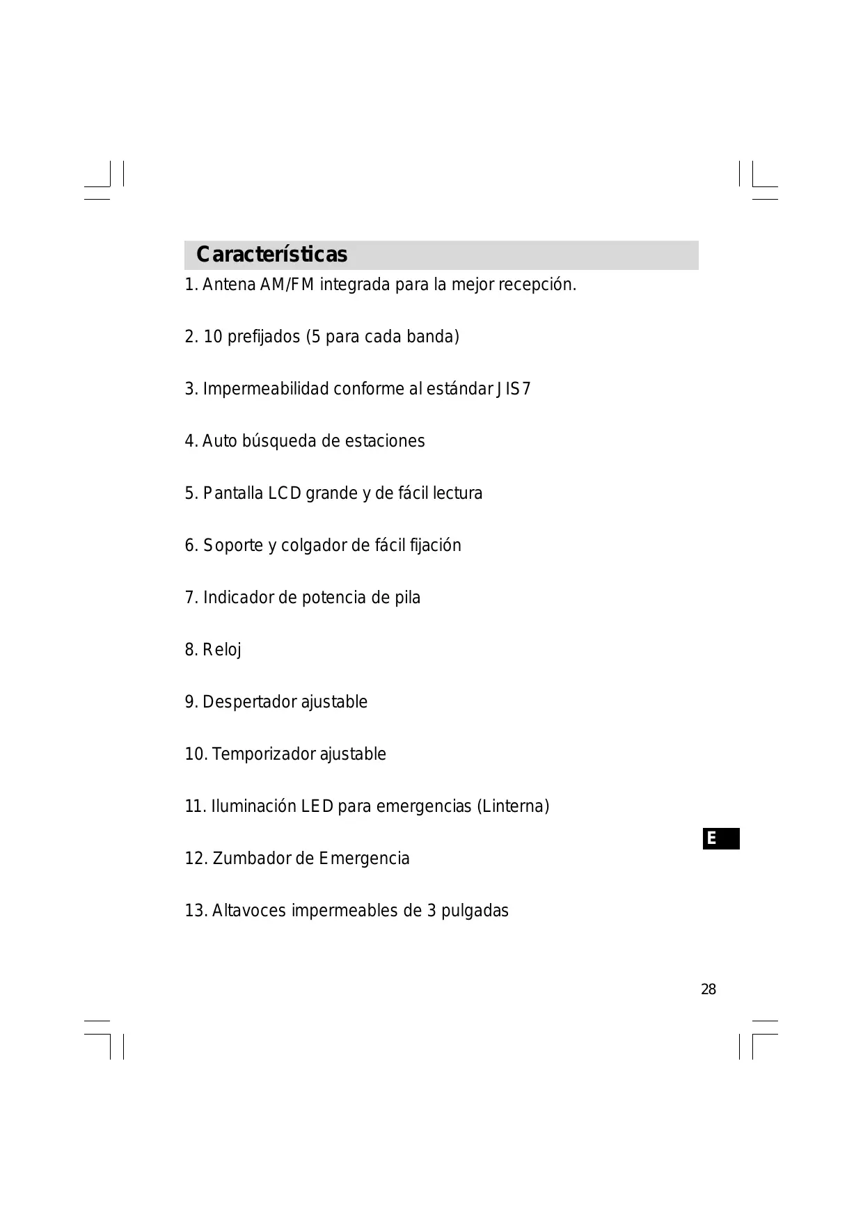 Especificaciones Consumo de energía Tomacorriente vía adaptador CA (no incluido) Solo CA 230 voltios, 50 Hz o CA 120 voltios, 60 Hz /DC 3V 300 mA Pilas: 2 x UM1 (tamaño D, LR20) Duración de Pila: Aprox. 120 horas de escucha para 4 horas diarias a volumen normal utilizando pilas alcalinas. Cobertura de Frecuencia: FM 87.50 – 108 MHz AM (MW) 522 – 1629 kHz. o 520 – 1710 kHz. Características del circuito Altavoz: 3 pulgadas, gama completa de 8 ohmios, impermeable Potencia de Salida: 500 mW Sistema de antena: FM Antena Alámbrica AM (MW) Barra de Ferrita