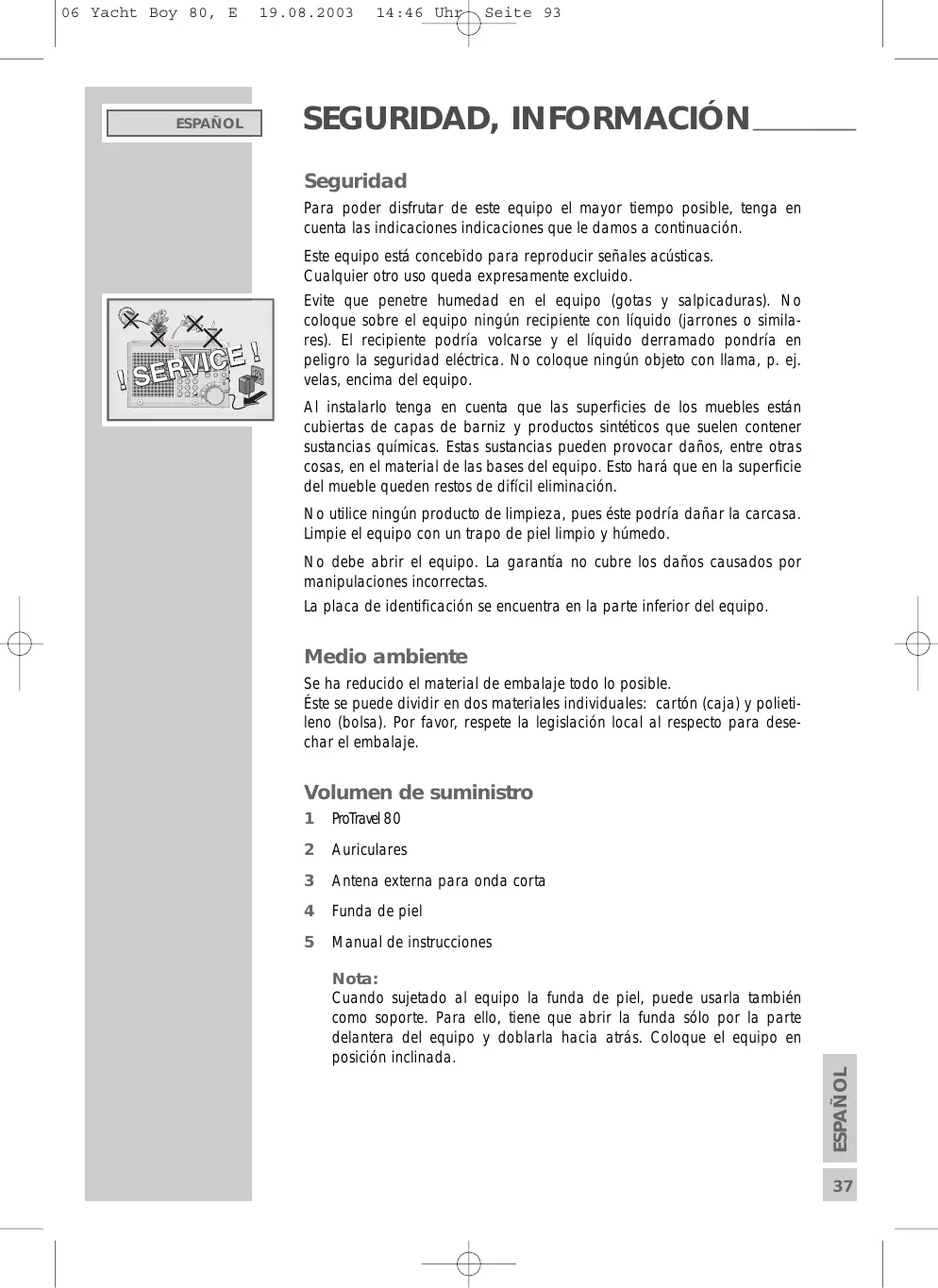Seguridad Para poder disfrutar de este equipo el mayor tempo posible, tenga en cuenta las indicaciones indicaciones que le damos à continuaciôn Este equipo esté concebido para reproducir señales acisticas. Cualquier otro uso queda expresamente excluido Evite que penete humedad en el equipo (gotas y salpicaduras). No coloque sobre el equipo ningün recipiente con liquido (jarrones o simila- res). El recipiente podria volcarse y el liquido derramado pondria en peligro la seguridad eléctrica. No coloque ningün objeto con llama, p. ej. velas, encima del equipo Al instlarlo tenga en cuenta que las superficies de los muebles estän cubiertas de capas de barniz y productos sintéticos que suelen contener sustancias quimicas. Estas sustancias pueden provocar daños, entre otras cosas, en el material de las bases del equipo. Esto hard que en la superficie del mueble queden restos de dificil eliminacién. No utilice ningün producto de limpieza, pues éste podria dañiar la carcasa. Limpie el equipo con un trapo de piel limpio y hémedo. No debe abrir el equipo. La garantia no cubre los daños causados por manipulaciones incorrectas. La placa de identficaciôn se encuentra en la parte inferior del equipo. Medio ambiente Se ha reducido el material de embalaje todo lo posible. Éste se puede dividir en dos materiales individuales: cartôn (caja) y polieti- leno (bolsa). Por favor, respete la legislaciôn local al respecto para dese- char el embalaje Volumen de suministro 1 Pole 80 2 Auriculares 3 Antena externa para onda corta 4 Funda de piel 5 Manual de instrucciones Nota: Cuando sujetado al equipo la funda de piel, puede usarla también como soporte. Para ello, tiene que abrir la funda sélo por la parte delantera del equipo y doblarla hacia atrés. Coloque el equipo en posicién inclinada