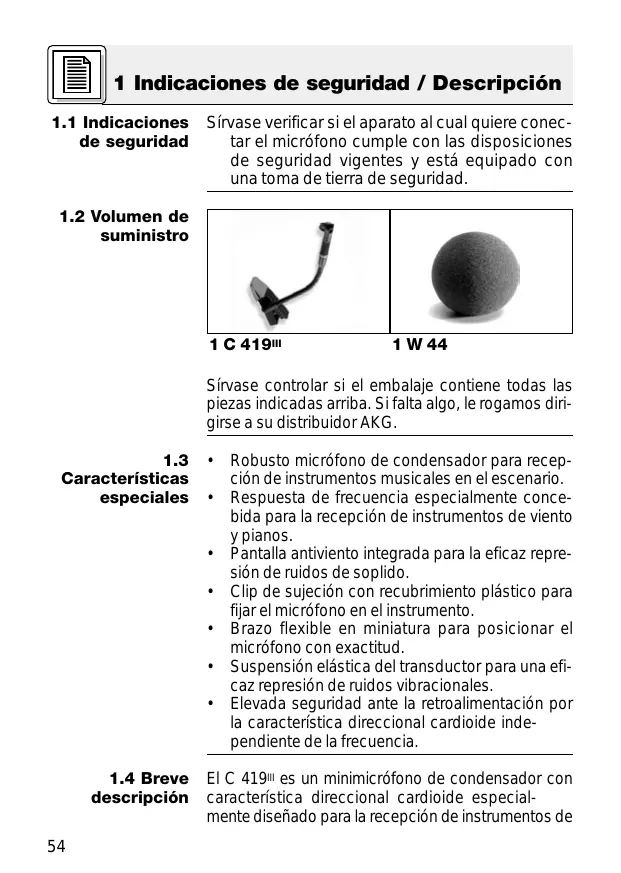 suministro 1 C 419III 1 W 44 Sírvase controlar si el embalaje contiene todas las piezas indicadas arriba. Si falta algo, le rogamos dirigirse a su distribuidor AKG. Características especiales