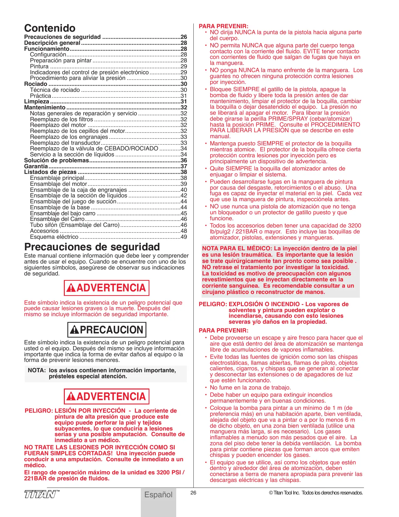 - Todos los accesorios deben tener una capacidad de 3200 lb/pulg2 / 221BAR o mayor. Esto incluye las boquillas de atomizador, pistolas, extensiones y mangueras. Precauciones de seguridad ................................................26 Descripción general .............................................................28 Funcionamiento....................................................................28 Configuración......................................................................28 Preparación para pintar ......................................................28 Pintura ................................................................................29 Indicadores del control de presión electrónico ...................29 Procedimiento para aliviar la presión .................................30 Rociado .................................................................................30 Técnica de rociado .............................................................30 Práctica ...............................................................................31 Limpieza ................................................................................31 Mantenimiento ......................................................................32 Notas generales de reparación y servicio ..........................32 Reemplazo de los filtros .....................................................32 Reemplazo del motor .........................................................32 Reemplazo de los cepillos del motor..................................32 Reemplazo de los engranajes ............................................33 Reemplazo del transductor.................................................33 Reemplazo de la válvula de CEBADO/ROCIADO .............34 Servicio a la sección de líquidos ........................................34 Solución de problemas........................................................36 Garantía .................................................................................37 Listados de piezas ...............................................................38 Ensamblaje principal...........................................................38 Ensamblaje del motor .........................................................39 Ensamblaje de la caja de engranajes ................................40 Ensamblaje de la sección de líquidos ................................42 Ensamblaje del juego de succión .......................................44 Ensamblaje de la base .......................................................44 Ensamblaje del bajo carro ........................................................45 Ensamblaje del Carro................................................................46 Tubo sifón (Ensamblaje del Carro).....................................46 Accesorios ..........................................................................48 Esquema eléctrico ..............................................................49 Precauciones de seguridad NOTA PARA EL MÉDICO: La inyección dentro de la piel es una lesión traumática. Es importante que la lesión se trate quirúrgicamente tan pronto como sea posible . NO retrase el tratamiento por investigar la toxicidad. La toxicidad es motivo de preocupación con algunos revestimientos que se inyectan directamente en la corriente sanguínea. Es recomendable consultar a un cirujano plástico o reconstructor de manos. Este manual contiene información que debe leer y comprender antes de usar el equipo. Cuando se encuentre con uno de los siguientes símbolos, asegúrese de observar sus indicaciones de seguridad. ADVERTENCIA Este símbolo indica la existencia de un peligro potencial que puede causar lesiones graves o la muerte. Después del mismo se incluye información de seguridad importante. PELIGRO: EXPLOSIÓN O INCENDIO - Los vapores de solventes y pintura pueden explotar o incendiarse, causando con esto lesiones severas y/o daños en la propiedad. PARA PREVENIR: