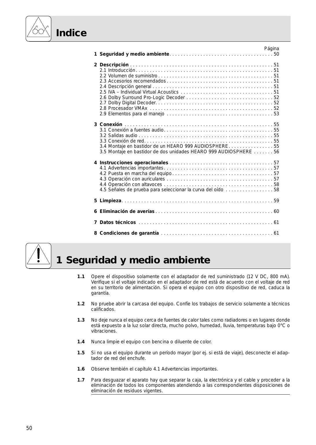 - p. 50 ¡Sirvase leer el manual antes de utilizar el equipo! Indice Página 1 Seguridad y medio ambiente 2 Descripción p. 50