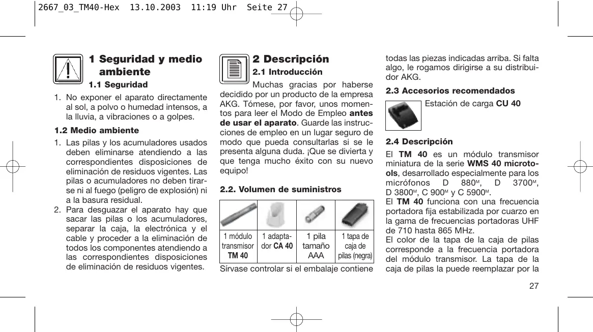 Muchas gracias por haberse decidido por un producto de la empresa AKG. Tómese, por favor, unos momentos para leer el Modo de Empleo antes de usar el aparato. Guarde las instrucciones de empleo en un lugar seguro de modo que pueda consultarlas si se le presenta alguna duda. ¡Que se divierta y que tenga mucho éxito con su nuevo equipo! 2.2. Volumen de suministros 1 módulo 1 adaptatransmisor dor CA 40 TM 40 1 tapa de 1 pila caja de tamaño pilas (negra) AAA Sírvase controlar si el embalaje contiene todas las piezas indicadas arriba. Si falta algo, le rogamos dirigirse a su distribuidor AKG.