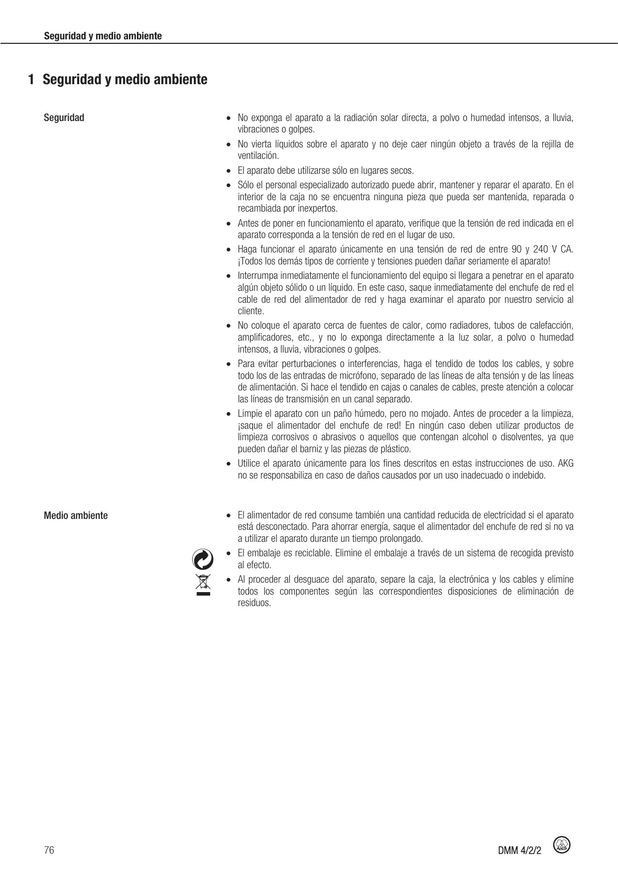 ¡Todos los demás tipos de corriente y tensiones pueden dañar seriamente el aparato! x Interrumpa inmediatamente el funcionamiento del equipo si llegara a penetrar en el aparato algún objeto sólido o un líquido. En este caso, saque inmediatamente del enchufe de red el cable de red del alimentador de red y haga examinar el aparato por nuestro servicio al cliente. x No coloque el aparato cerca de fuentes de calor, como radiadores, tubos de calefacción, amplificadores, etc., y no lo exponga directamente a la luz solar, a polvo o humedad intensos, a lluvia, vibraciones o golpes. x Para evitar perturbaciones o interferencias, haga el tendido de todos los cables, y sobre todo los de las entradas de micrófono, separado de las líneas de alta tensión y de las líneas de alimentación. Si hace el tendido en cajas o canales de cables, preste atención a colocar las líneas de transmisión en un canal separado. x Limpie el aparato con un paño húmedo, pero no mojado. Antes de proceder a la limpieza, ¡saque el alimentador del enchufe de red! En ningún caso deben utilizar productos de limpieza corrosivos o abrasivos o aquellos que contengan alcohol o disolventes, ya que pueden dañar el barniz y las piezas de plástico. x Utilice el aparato únicamente para los fines descritos en estas instrucciones de uso. AKG no se responsabiliza en caso de daños causados por un uso inadecuado o indebido.
