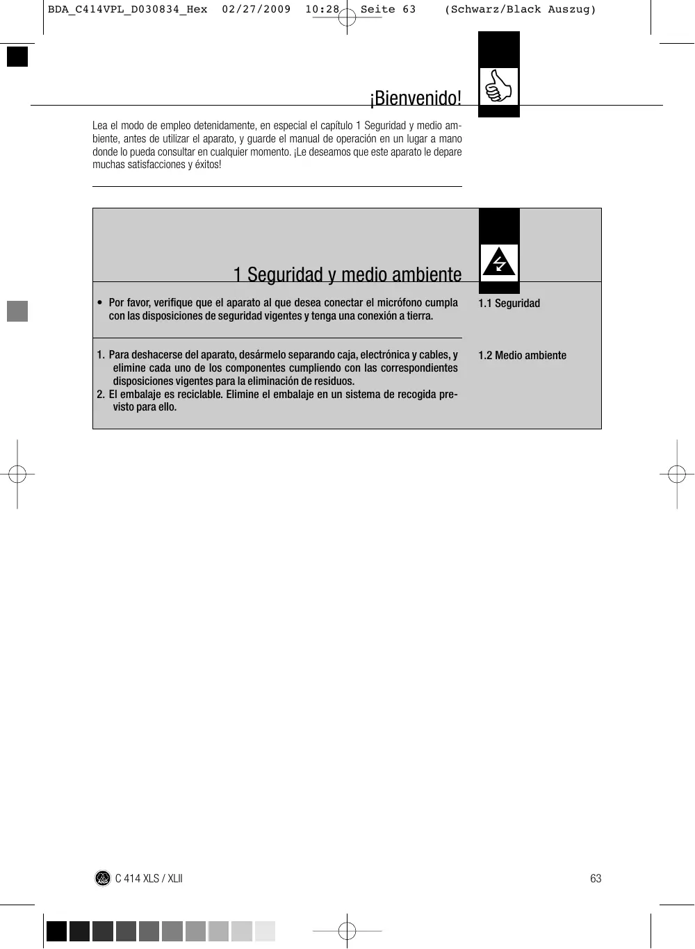 Página ¡Bienvenido! . . . . . . . . . . . . . . . . . . . . . . . . . . . . . . . . . . . . . . . . . . . . . . . . . . . . . . . . . . . . . 63 1 Seguridad y medio ambiente . . . . . . . . . . . . . . . . . . . . . . . . . . . . . . . . . . . . . . . . . . . . . . 63 1.1 Seguridad . . . . . . . . . . . . . . . . . . . . . . . . . . . . . . . . . . . . . . . . . . . . . . . . . . . . . . . . . . 63 1.2 Medio ambiente. . . . . . . . . . . . . . . . . . . . . . . . . . . . . . . . . . . . . . . . . . . . . . . . . . . . . . 63 2 Descripción. . . . . . . . . . . . . . . . . . . . . . . . . . . . . . . . . . . . . . . . . . . . . . . . . . . . . . . . . . . . 64 2.1 Volumen de suministros . . . . . . . . . . . . . . . . . . . . . . . . . . . . . . . . . . . . . . . . . . . . . . . . 64 2.2 Accesorios opcionales . . . . . . . . . . . . . . . . . . . . . . . . . . . . . . . . . . . . . . . . . . . . . . . . . 64 2.3 C 414 XLS. . . . . . . . . . . . . . . . . . . . . . . . . . . . . . . . . . . . . . . . . . . . . . . . . . . . . . . . . . 64 2.3.1 Controles . . . . . . . . . . . . . . . . . . . . . . . . . . . . . . . . . . . . . . . . . . . . . . . . . . . . . . 66 2.4 C 414 XLII . . . . . . . . . . . . . . . . . . . . . . . . . . . . . . . . . . . . . . . . . . . . . . . . . . . . . . . . . . 66 2.5 Pares de micrófonos estéreo. . . . . . . . . . . . . . . . . . . . . . . . . . . . . . . . . . . . . . . . . . . . . 66 3 Alimentación. . . . . . . . . . . . . . . . . . . . . . . . . . . . . . . . . . . . . . . . . . . . . . . . . . . . . . . . . . . 67 4 Indicaciones de aplicación . . . . . . . . . . . . . . . . . . . . . . . . . . . . . . . . . . . . . . . . . . . . . . . . 68 4.1 Introducción . . . . . . . . . . . . . . . . . . . . . . . . . . . . . . . . . . . . . . . . . . . . . . . . . . . . . . . . 68 4.2 Atenuación de bajos . . . . . . . . . . . . . . . . . . . . . . . . . . . . . . . . . . . . . . . . . . . . . . . . . . . 68 4.3 Preatenuación . . . . . . . . . . . . . . . . . . . . . . . . . . . . . . . . . . . . . . . . . . . . . . . . . . . . . . . 68 4.4 Montaje en el soporte . . . . . . . . . . . . . . . . . . . . . . . . . . . . . . . . . . . . . . . . . . . . . . . . . . 68 4.5 Ambitos de aplicación . . . . . . . . . . . . . . . . . . . . . . . . . . . . . . . . . . . . . . . . . . . . . . . . . 68 4.6 Consejos de emplazamiento . . . . . . . . . . . . . . . . . . . . . . . . . . . . . . . . . . . . . . . . . . . . . 69 4.6.1 Vocalista solista. . . . . . . . . . . . . . . . . . . . . . . . . . . . . . . . . . . . . . . . . . . . . . . . . . 69 4.6.2 Coro/coro de acompañamiento. . . . . . . . . . . . . . . . . . . . . . . . . . . . . . . . . . . . . . . 70 4.6.3 Violín, viola . . . . . . . . . . . . . . . . . . . . . . . . . . . . . . . . . . . . . . . . . . . . . . . . . . . . . 70 4.6.4 Contrabajo, violoncelo . . . . . . . . . . . . . . . . . . . . . . . . . . . . . . . . . . . . . . . . . . . . . 71 4.6.5 Guitarra acústica. . . . . . . . . . . . . . . . . . . . . . . . . . . . . . . . . . . . . . . . . . . . . . . . . 71 4.6.6 Flauta travesera . . . . . . . . . . . . . . . . . . . . . . . . . . . . . . . . . . . . . . . . . . . . . . . . . 72 4.6.7 Clarinete. . . . . . . . . . . . . . . . . . . . . . . . . . . . . . . . . . . . . . . . . . . . . . . . . . . . . . . 72 4.6.8 Saxofón tenor/soprano. . . . . . . . . . . . . . . . . . . . . . . . . . . . . . . . . . . . . . . . . . . . . 72 4.6.9 Trompeta/trombón. . . . . . . . . . . . . . . . . . . . . . . . . . . . . . . . . . . . . . . . . . . . . . . . 73 4.6.10 Piano de cola/vertical. . . . . . . . . . . . . . . . . . . . . . . . . . . . . . . . . . . . . . . . . . . . . 73 4.6.11 Guitarra eléctrica/bajo eléctrico . . . . . . . . . . . . . . . . . . . . . . . . . . . . . . . . . . . . . 74 4.6.12 Batería . . . . . . . . . . . . . . . . . . . . . . . . . . . . . . . . . . . . . . . . . . . . . . . . . . . . . . . 74 5 Limpieza . . . . . . . . . . . . . . . . . . . . . . . . . . . . . . . . . . . . . . . . . . . . . . . . . . . . . . . . . . . . . . 75 5.1 Micrófono . . . . . . . . . . . . . . . . . . . . . . . . . . . . . . . . . . . . . . . . . . . . . . . . . . . . . . . . . . 75 5.2 Pantalla antiviento . . . . . . . . . . . . . . . . . . . . . . . . . . . . . . . . . . . . . . . . . . . . . . . . . . . . 75 6 Datos técnicos . . . . . . . . . . . . . . . . . . . . . . . . . . . . . . . . . . . . . . . . . . . . . . . . . . . . . . . . . 75
