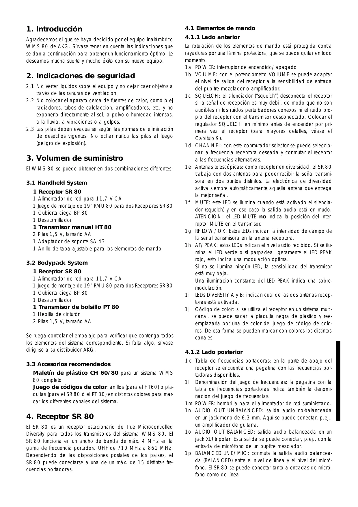 4.1.1 Lado anterior La rotulación de los elementos de mando está protegida contra rayaduras por una lámina protectora, que se puede quitar en todo momento. 1a POWER: interruptor de encendido/apagado 1b VOLUME: con el potenciómetro VOLUME se puede adaptar el nivel de salida del receptor a la sensibilidad de entrada del pupitre mezclador o amplificador. 1c SQUELCH: el silenciador (”squelch”) desconecta el receptor si la señal de recepción es muy débil, de modo que no son audibles ni los ruidos perturbadores conexos ni el ruido propio del receptor con el transmisor desconectado. Colocar el regulador SQUELCH en mínimo antes de encender por primera vez el receptor (para mayores detalles, véase el Capítulo 9). 1d CHANNEL: con este conmutador selector se puede seleccionar la frecuencia receptora deseada y conmutar el receptor a las frecuencias alternativas. 1e Antenas telescópicas: como receptor en diversidad, el SR 80 trabaja con dos antenas para poder recibir la señal transmisora en dos puntos distintos. La electrónica de diversidad activa siempre automáticamente aquella antena que entrega la mejor señal. 1f MUTE: este LED se ilumina cuando está activado el silenciador (squelch) y en ese caso la salida audio está en mudo. ATENCION: el LED MUTE no indica la posición del interruptor MUTE en el transmisor. 1g RF LOW/OK: Estos LEDs indican la intensidad de campo de la señal transmisora en la antena receptora. 1h AF/PEAK: estos LEDs indican el nivel audio recibido. Si se ilumina el LED verde o si parpadea ligeramente el LED PEAK rojo, esto indica una modulación óptima. Si no se ilumina ningún LED, la sensibilidad del transmisor está muy baja. Una iluminación constante del LED PEAK indica una sobremodulación. 1i LEDs DIVERSITY A y B: indican cual de las dos antenas receptoras está activada. 1j Código de color: si se utiliza el receptor en un sistema multicanal, se puede sacar la plaquita negra de plástico y reeemplazarla por una de color del juego de código de colores. De esa forma se pueden marcar con colores los distintos canales. 4.1.2 Lado posterior 1k Tabla de frecuencias portadoras: en la parte de abajo del receptor se encuentra una pegatina con las frecuencias portadoras disponibles. 1l Denominación del juego de frecuencias: la pegatina con la tabla de frecuencias portadoras indica también la denominación del juego de frecuencias. 1m POWER: hembrilla para el alimentador de red suministrado. 1n AUDIO OUT UNBALANCED: salida audio no-balanceada en un jack mono de 6.3 mm. Aquí se puede conectar, p.ej., un amplificador de guitarra. 1o AUDIO OUT BALANCED: salida audio balanceada en un jack XLR tripolar. Esta salida se puede conectar, p.ej., con la entrada de micrófono de un pupitre mezclador. 1p BALANCED LINE/MIC: conmuta la salida audio balanceada (BALANCED) entre el nivel de línea y el nivel del micrófono. El SR 80 se puede conectar tanto a entradas de micrófono como de línea.
