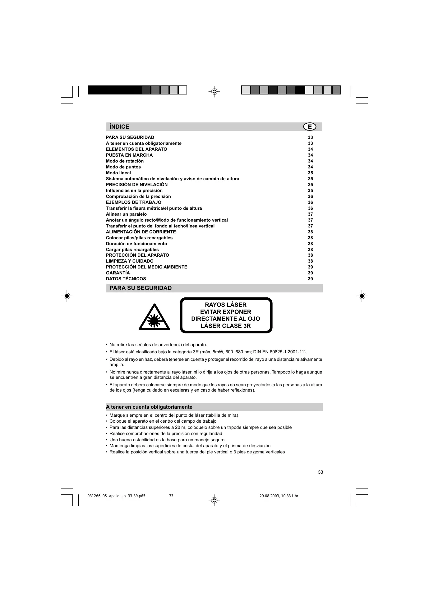 + El lâser esté clasificado bajo la categoria 3R (mäx. 5mW, 600..680 nm; DIN EN 60825-1:2001-11) + Debido al rayo en haz, deberä tenerse en cuenta y proteger el recorrido del rayo a una distancia relativamente amplia + No mire nunca directamente al rayo lâser, ni lo dirija a los ojos de otras personas. Tampoco lo haga aunque se encuentren a gran distancia del aparato. + El aparato deberä colocarse siempre de modo que los rayos no sean proyectados a las personas a la altura de los ojos (tenga cuidado en escaleras y en caso de haber reflexiones) A tener en cuenta obligatoriamente + Marque siempre en el centro del punto de läser (tabllla de mira) + Coloque el aparato en el centro del campo de trabajo + Para las distancias superiores a 20 m, coléquelo sobre un tripode siempre que sea posible + Realice comprobaciones de la precisiôn con regularidad + Una buena estabilidad es la base para un manejo seguro + Mantenga limpias las superficies de cristal del aparato y el prisma de desviaciôn + Realice la posicién vertical sobre una tuerca del pie vertical o 3 pies de goma verticales | 031266_05_apollo_sp_33-39.p65 3 un