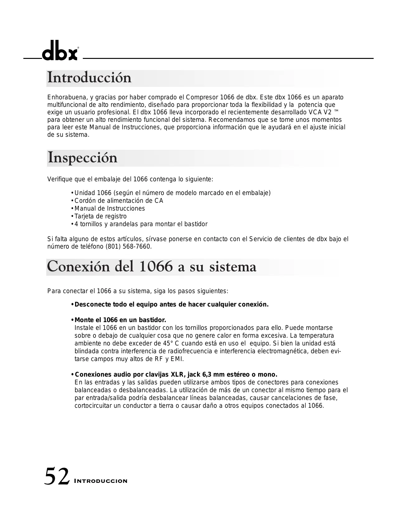 Introducción Enhorabuena, y gracias por haber comprado el Compresor 1066 de dbx. Este dbx 1066 es un aparato multifuncional de alto rendimiento, diseñado para proporcionar toda la flexibilidad y la potencia que exige un usuario profesional. El dbx 1066 lleva incorporado el recientemente desarrollado VCA V2 ™ para obtener un alto rendimiento funcional del sistema. Recomendamos que se tome unos momentos para leer este Manual de Instrucciones, que proporciona información que le ayudará en el ajuste inicial de su sistema. Inspección Verifique que el embalaje del 1066 contenga lo siguiente: