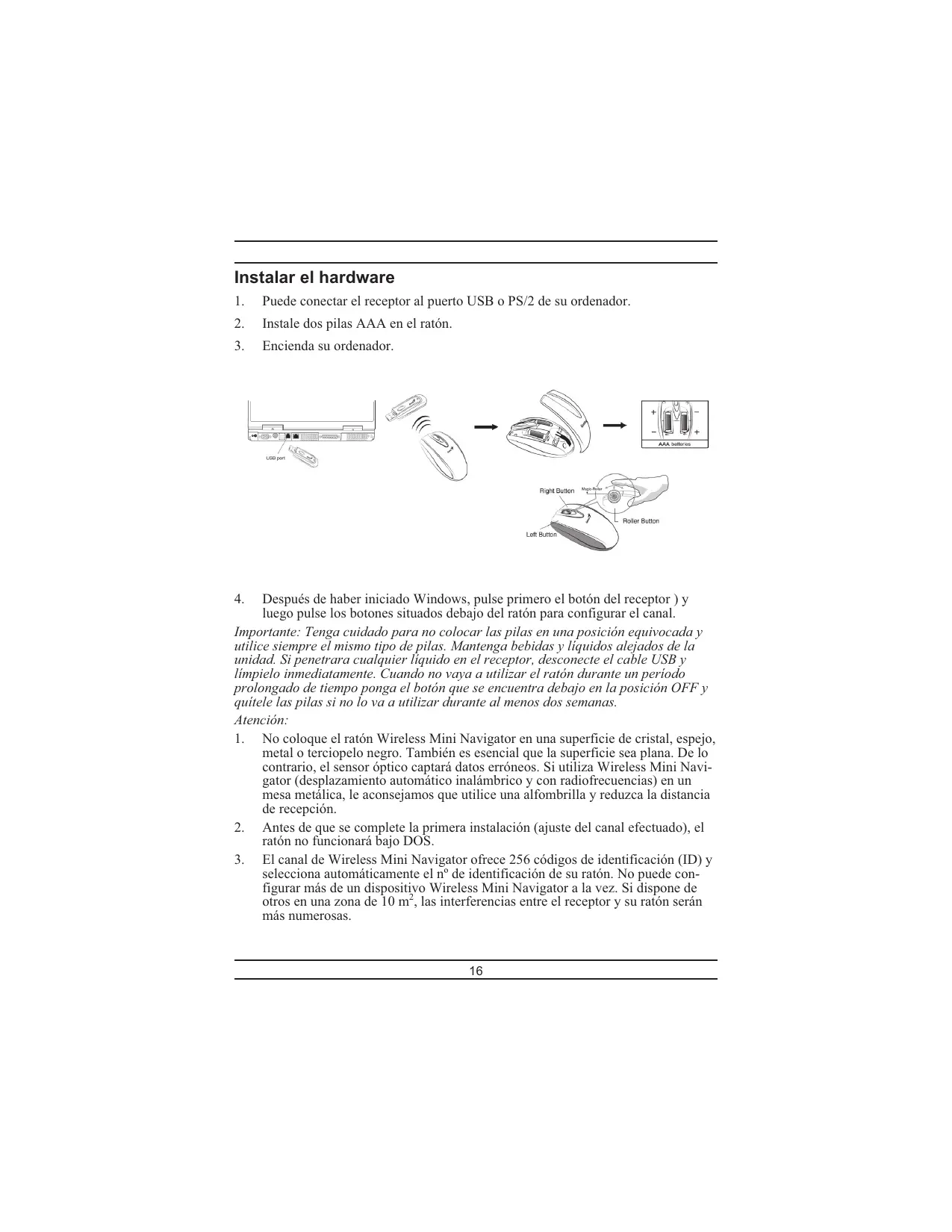 Después de haber iniciado Windows, pulse primero el botón del receptor ) y luego pulse los botones situados debajo del ratón para configurar el canal. Importante: Tenga cuidado para no colocar las pilas en una posición equivocada y utilice siempre el mismo tipo de pilas. Mantenga bebidas y líquidos alejados de la unidad. Si penetrara cualquier líquido en el receptor, desconecte el cable USB y límpielo inmediatamente. Cuando no vaya a utilizar el ratón durante un período prolongado de tiempo ponga el botón que se encuentra debajo en la posición OFF y quítele las pilas si no lo va a utilizar durante al menos dos semanas. Atención: